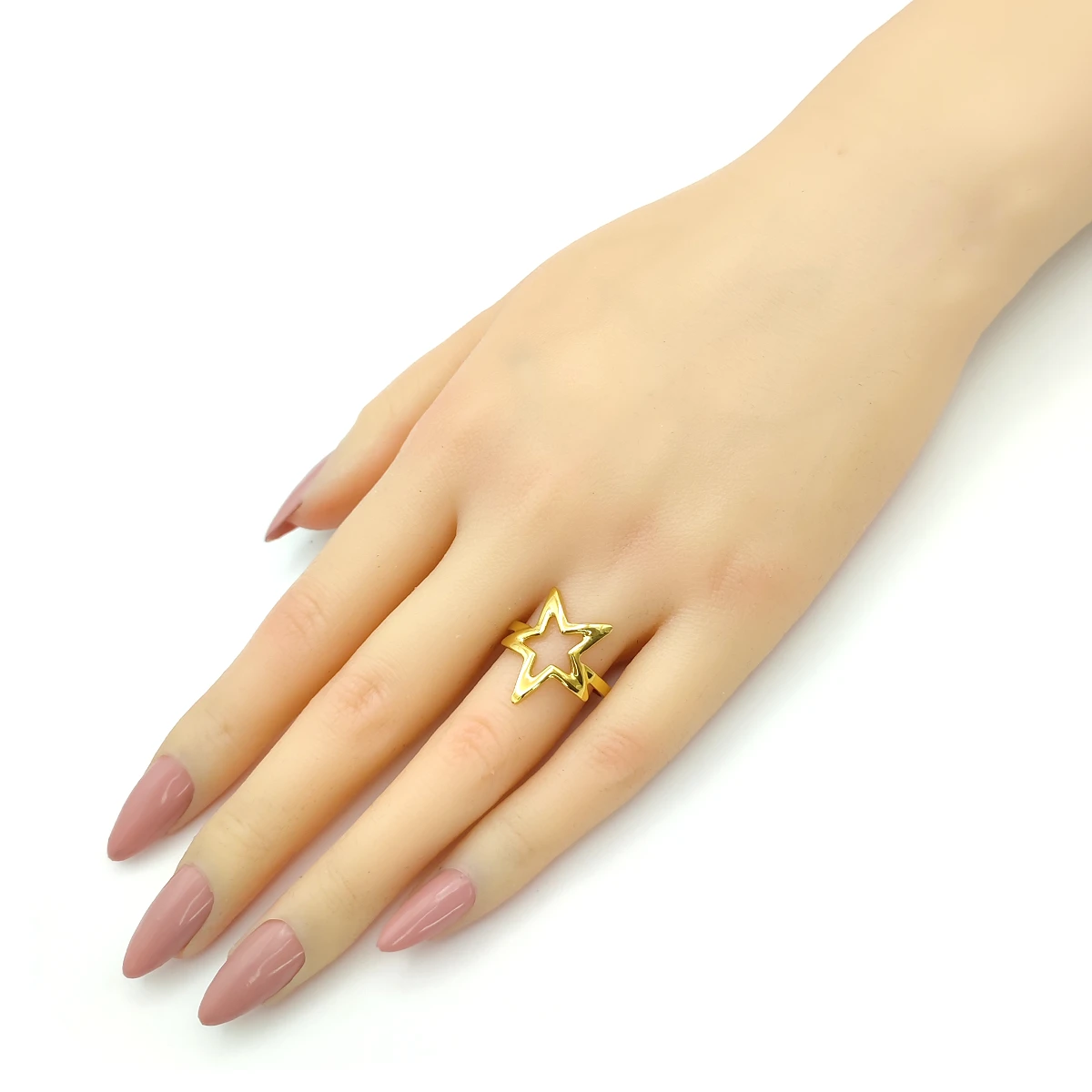 Este anillo dorado de acero inoxidable destaca por su diseño de contorno de estrella lisa, una figura moderna y delicada que aporta un toque juvenil y elegante a cualquier estilo. Su forma minimalista crea un acabado limpio y brillante que resalta la silueta de la estrella, convirtiéndolo en un accesorio perfecto para quienes buscan una pieza sutil pero con personalidad.