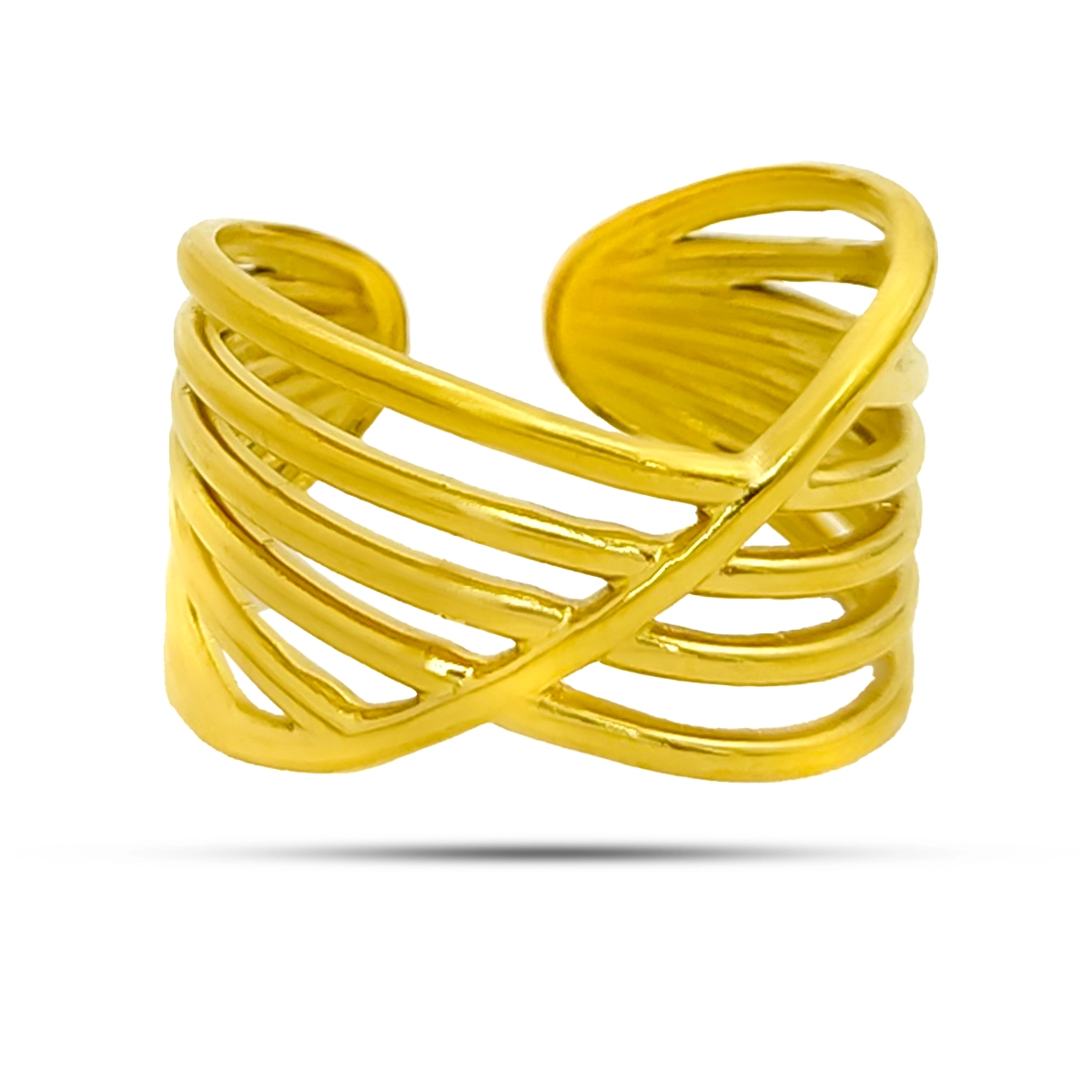 Anillo de acero inoxidable para diario, oficina o layering, con diseño cruzado minimalista, acabado dorado y frente ajustable de 13 mm.