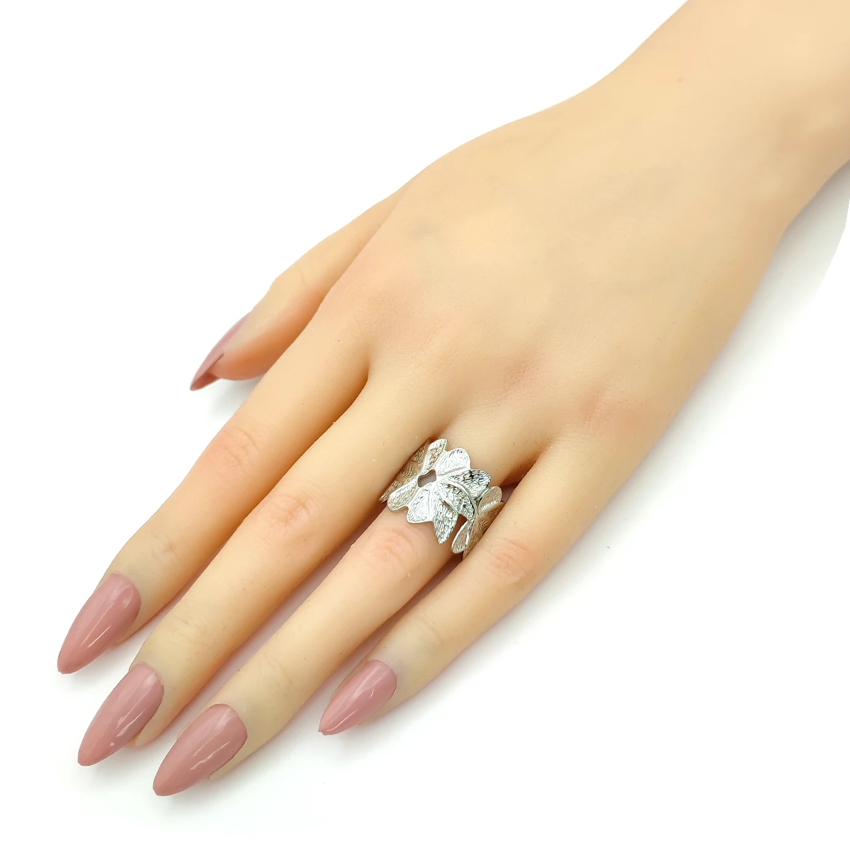 Este anillo plateado de acero inoxidable con diseño de flores unidas ofrece un estilo moderno con un toque artesanal que lo hace destacar en cualquier colección. Su estructura gruesa aporta presencia y firmeza, mientras que las flores integradas crean un acabado delicado y atractivo que equilibra perfectamente la robustez del diseño. El acabado liso y brillante del acero inoxidable realza cada detalle floral, aportando elegancia sin perder la esencia contemporánea.