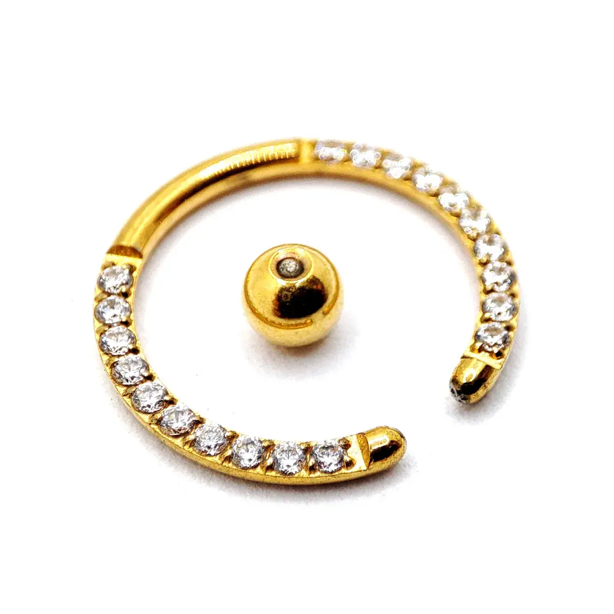 Sumérgete en la exquisita fusión de audacia y luminosidad con el Arete Acero Dorado Tipo Piercing Aro Captive 10 mm Cristal. Esta joya única no solo celebra la elegancia del acero dorado, sino que también se destaca por su diseño tipo captive con un cristal incrustado, perfecto para ser lucido con confianza en la nariz o la oreja.