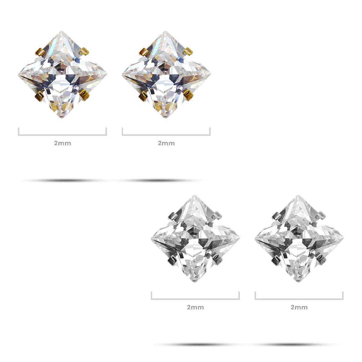 La pieza central de cada broquel es una zirconia cuadrada brillante, disponible en una amplia gama de tamaños que van desde 2 mm hasta 8 mm, lo que permite elegir el nivel de protagonismo que se desea. Los tamaños más pequeños aportan un detalle delicado y discreto, mientras que los más grandes generan un impacto visual llamativo y sofisticado. Esta variedad los convierte en un accesorio adaptable a todo tipo de estilos y ocasiones.
