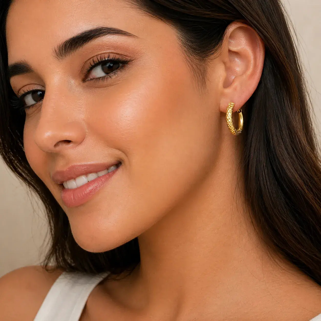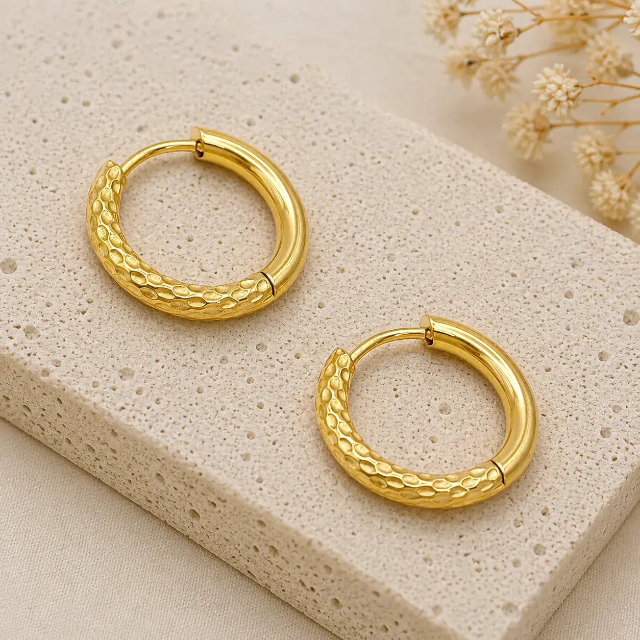 Aretes arracadas tipo huggies en tono dorado con diseño mitad martillado que aportan textura y un brillo distintivo sin ser exagerado. Son perfectos para complementar looks casuales o elevar un outfit sencillo, ideales para el uso diario, salidas, trabajo o reuniones donde quieres lucir arreglada sin esfuerzo.