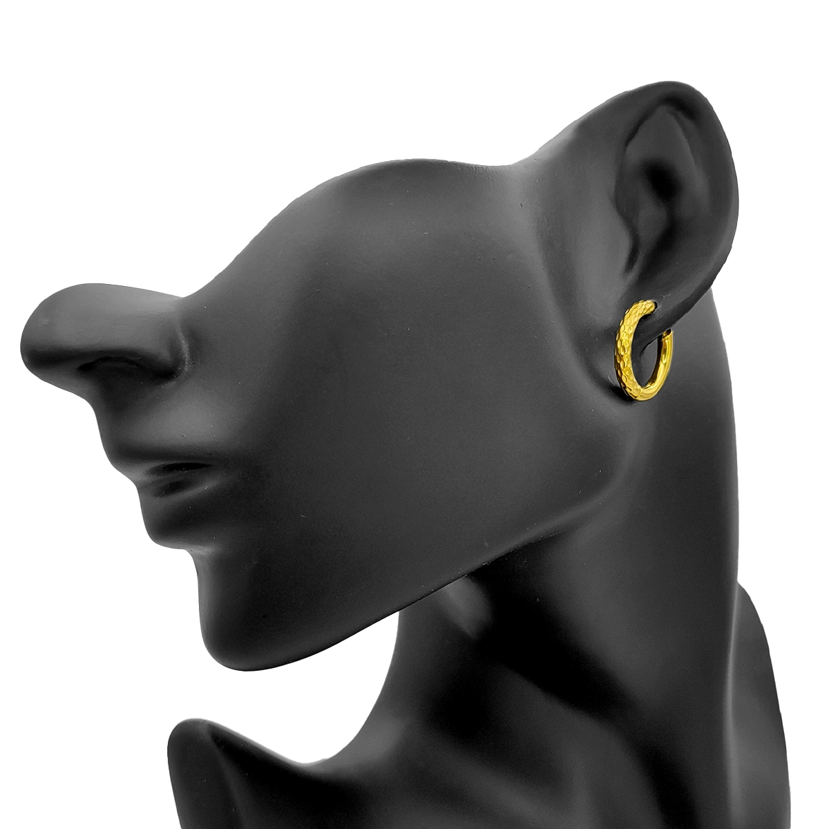 Su fabricación en acero inoxidable los hace hipoalergénicos y resistentes al agua, permitiendo mantener su color dorado brillante por más tiempo sin despintarse fácilmente. Con un diámetro de 17 mm y un ancho de 3 mm, ofrecen un ajuste cómodo que se adapta bien a la oreja, brindando presencia sin ser pesados. Son una excelente opción de regalo para amigas, hermanas o pareja que buscan accesorios versátiles y modernos. Dale un toque actual a tu estilo y agrégalos a tu colección hoy mismo.