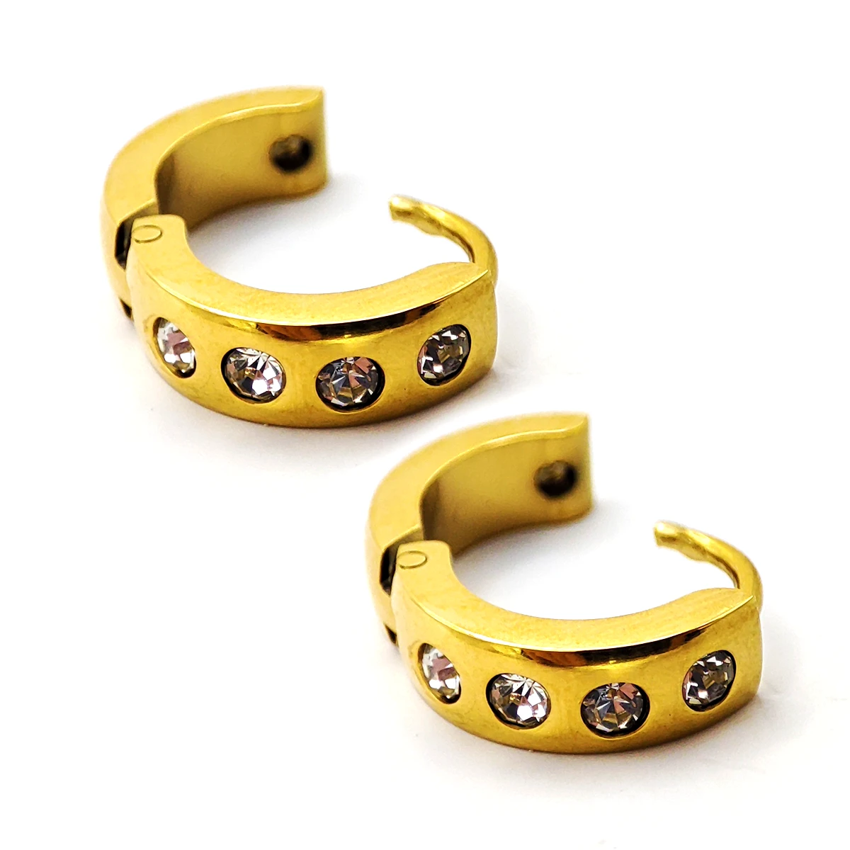 Los Aretes de Acero Dorado Huggies Lisos con Cuatro Cristales son una excelente elección para quienes desean un accesorio duradero, de diseño limpio y con un toque de brillo, ideal para llevar en cualquier momento y lugar.