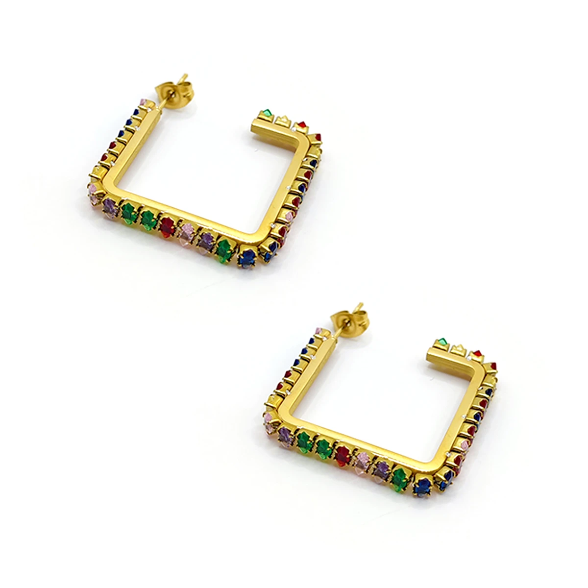 Fabricados con acero inoxidable de alta calidad, estos aretes garantizan resistencia y un acabado dorado que se mantiene impecable con el tiempo. Su diseño de arracadas cuadradas ofrece una apariencia moderna y estilizada, ideal para quienes buscan destacar con un toque contemporáneo. Los cristales multicolores incrustados añaden un toque de alegría y luminosidad, reflejando la luz de manera espectacular y creando un efecto visual impresionante.