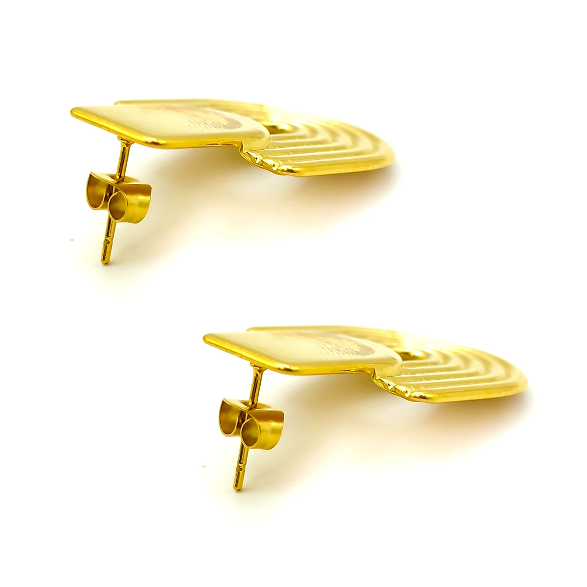 Estos aretes dorados de acero inoxidable destacan por su diseño tipo cúpula ondulada con líneas finas que recorren la superficie, creando un efecto visual dinámico, moderno y sofisticado. La forma abombada añade volumen sin ser pesada, mientras que las ondas con líneas marcadas aportan textura, brillo y un toque artístico que los diferencia de los diseños lisos tradicionales. Su acabado pulido refleja la luz con suavidad, logrando un estilo elegante ideal para complementar desde atuendos casuales hasta looks más formales.