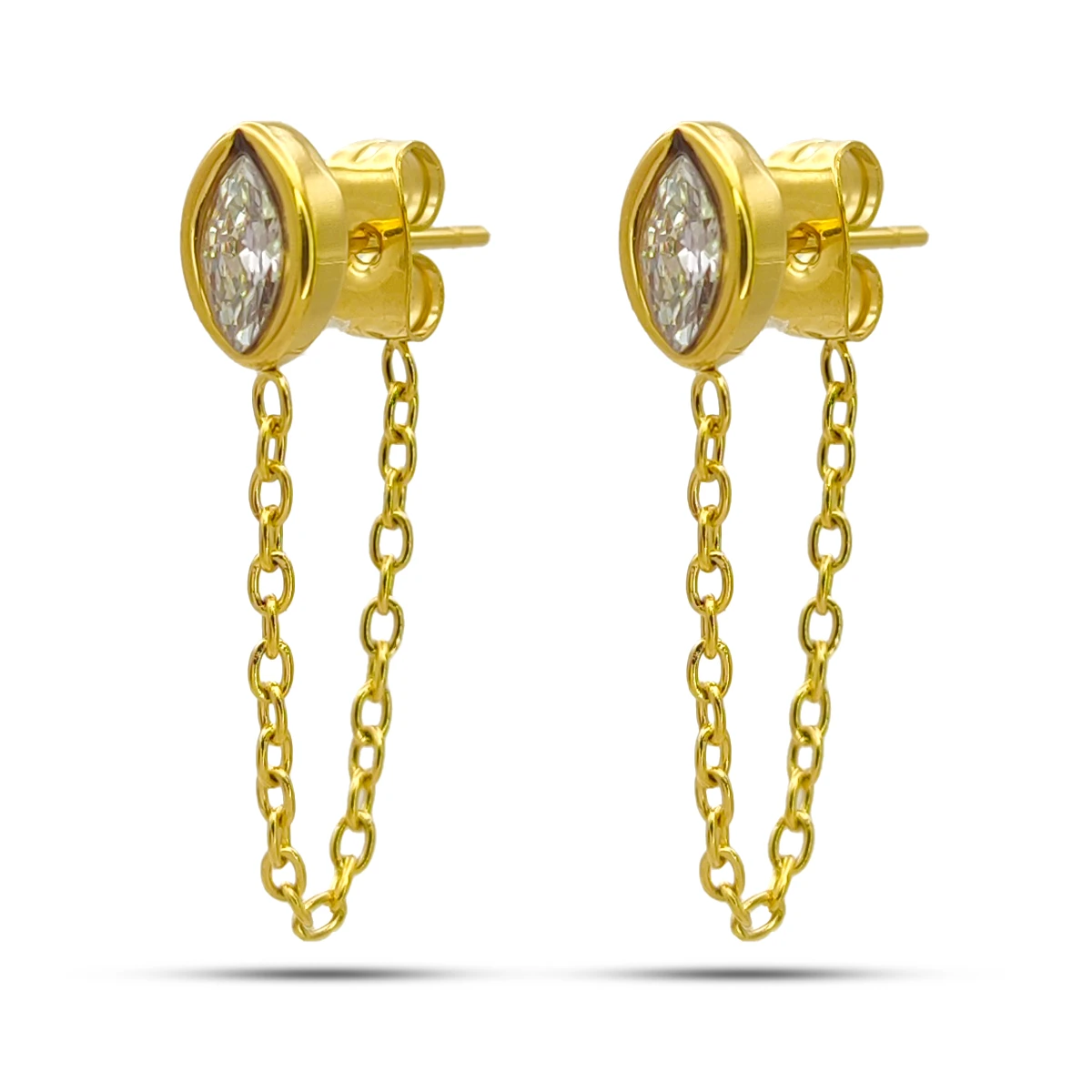 Broqueles de acero dorado con cristal marquesa clara y delicada cadena que conecta al cierre tipo mariposa.