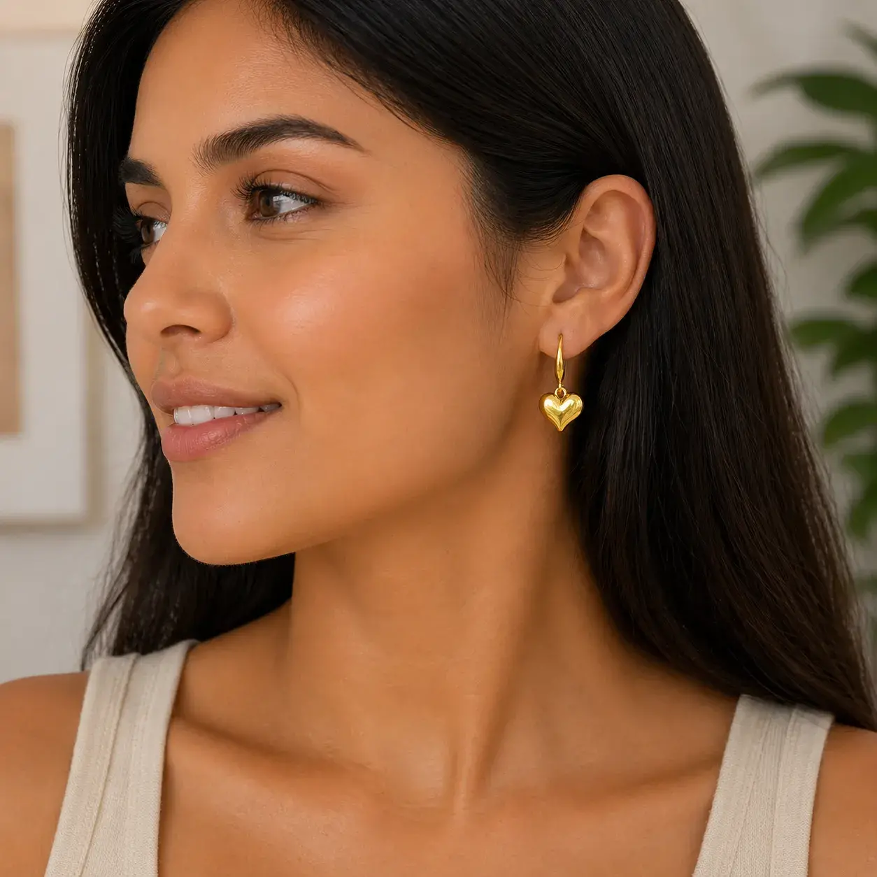 Aretes de acero inoxidable dorados con gancho y corazón colgante, ideales para mujer que busca un accesorio femenino, romántico y fácil de combinar. Su diseño estiliza visualmente el rostro gracias a su caída ligera y al brillo del acabado pulido, mientras el corazón liso aporta un toque tierno y moderno que funciona muy bien con looks casuales, outfits de oficina, citas, salidas y ocasiones especiales.