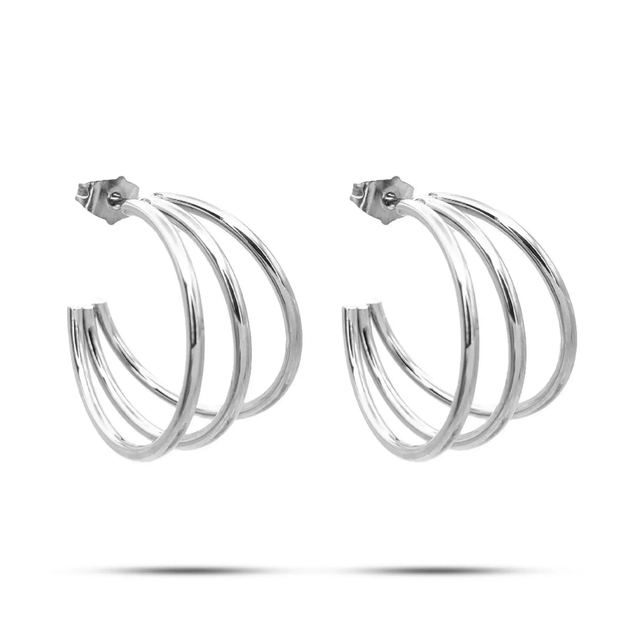 Fabricados en acero inoxidable de alta calidad, estos aretes garantizan resistencia al desgaste, durabilidad y un acabado brillante, manteniéndose impecables con el tiempo. Su diseño de media arracada triple tubular crea un efecto tridimensional que realza la estructura del accesorio, aportando una combinación de elegancia y modernidad.
