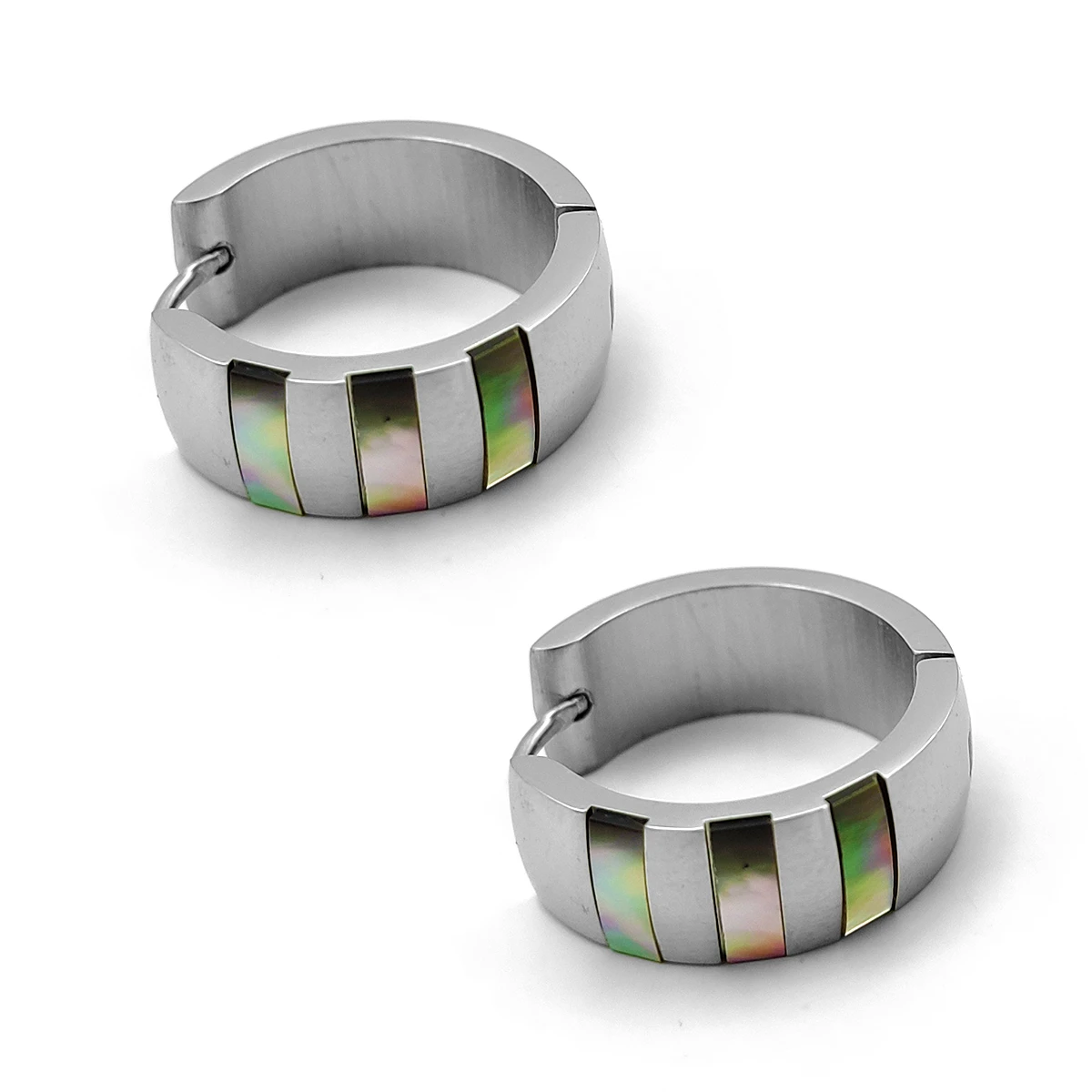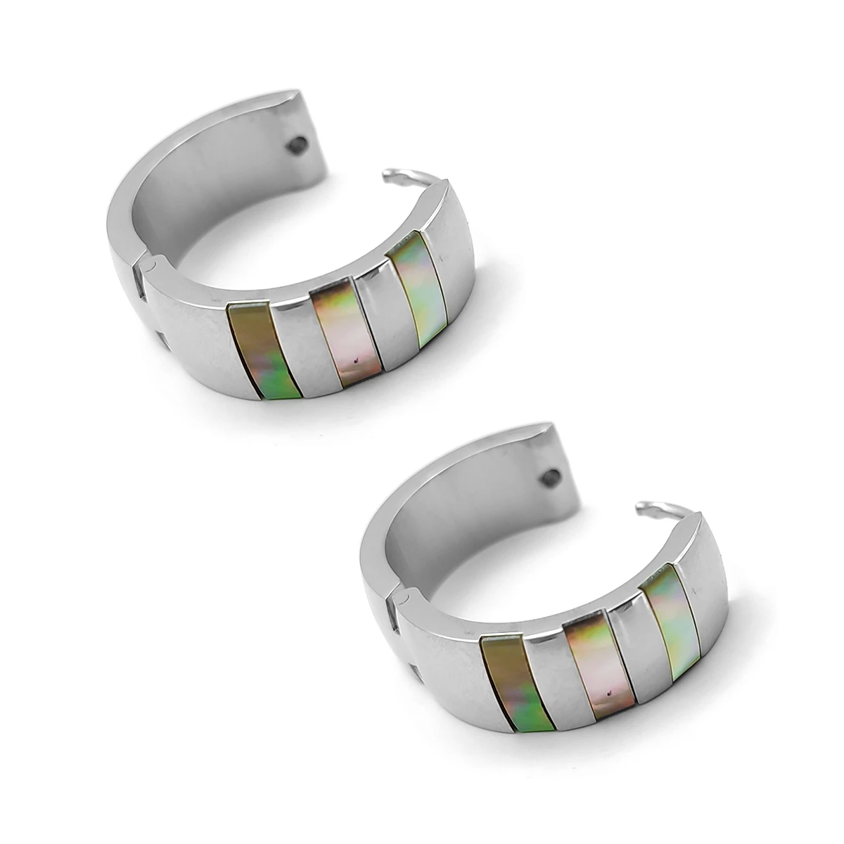 El tono plateado pulido del acero crea un contraste equilibrado con las bandas nacaradas, logrando un accesorio refinado y moderno. Son ideales para usar tanto en el día a día como en eventos especiales, ya que su diseño compacto y atemporal los convierte en una pieza clave dentro de cualquier colección de joyería.