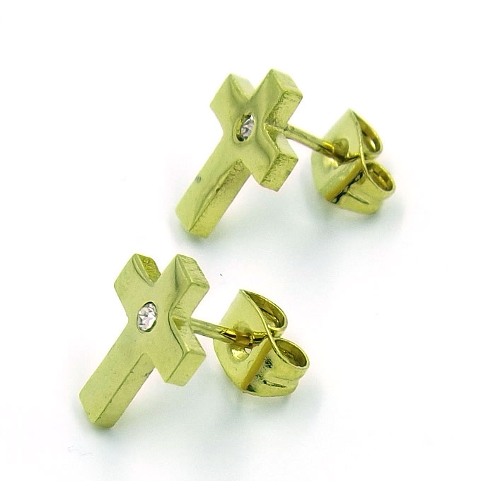 Aretes tipo Broquel Dorados Cruz Recta con Cristal