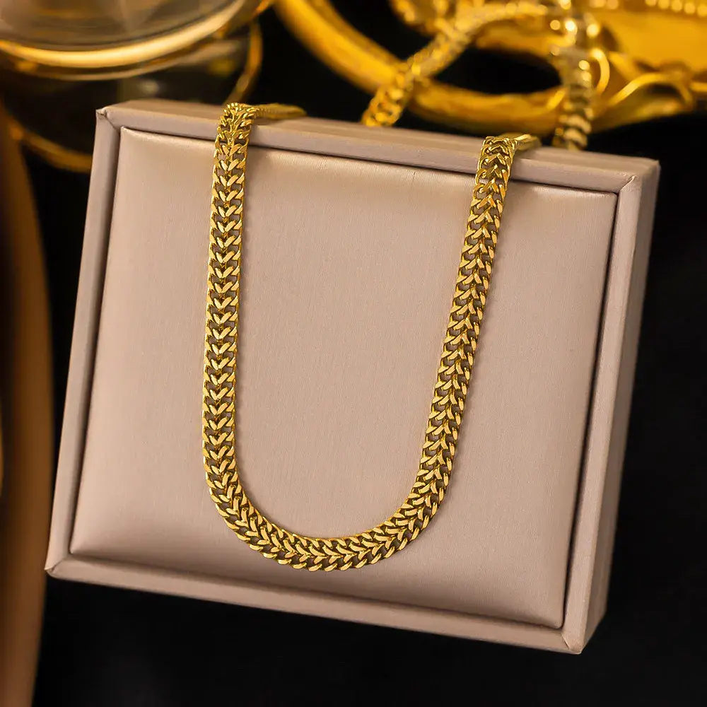 Queda muy bien con blusas lisas, camisas abiertas, tops, vestidos y outfits de oficina o salida. Además, el acero inoxidable ofrece beneficios que sí importan al comprar: es hipoalergénico, resistente al agua y mantiene mejor su brillo dorado con el uso frecuente. Si buscas una cadena vistosa, durable y fácil de combinar, esta es una excelente elección.