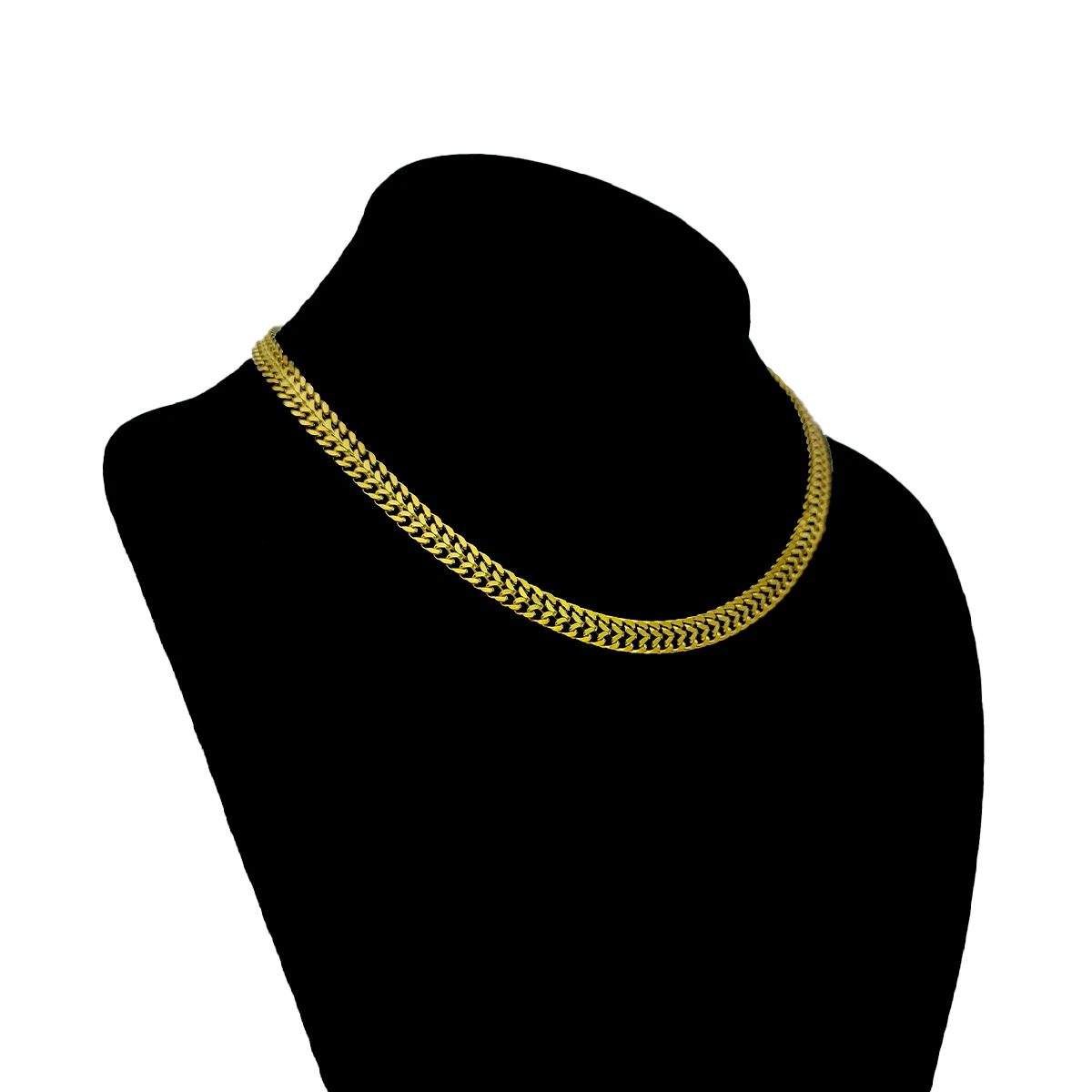 Cadena cubana dorada de acero inoxidable doble fila, ideal para quien quiere un collar con más presencia visual sin recurrir a capas separadas. Su diseño unido da el efecto de dos cadenas en una sola pieza, así que ayuda a enmarcar mejor el cuello y a que un look sencillo se vea más completo al instante. Con 40 cm de largo más 5 cm de extensión y 6 mm de ancho, se adapta con mayor facilidad a distintos escotes y permite llevarla más pegada o ligeramente más suelta según tu estilo.