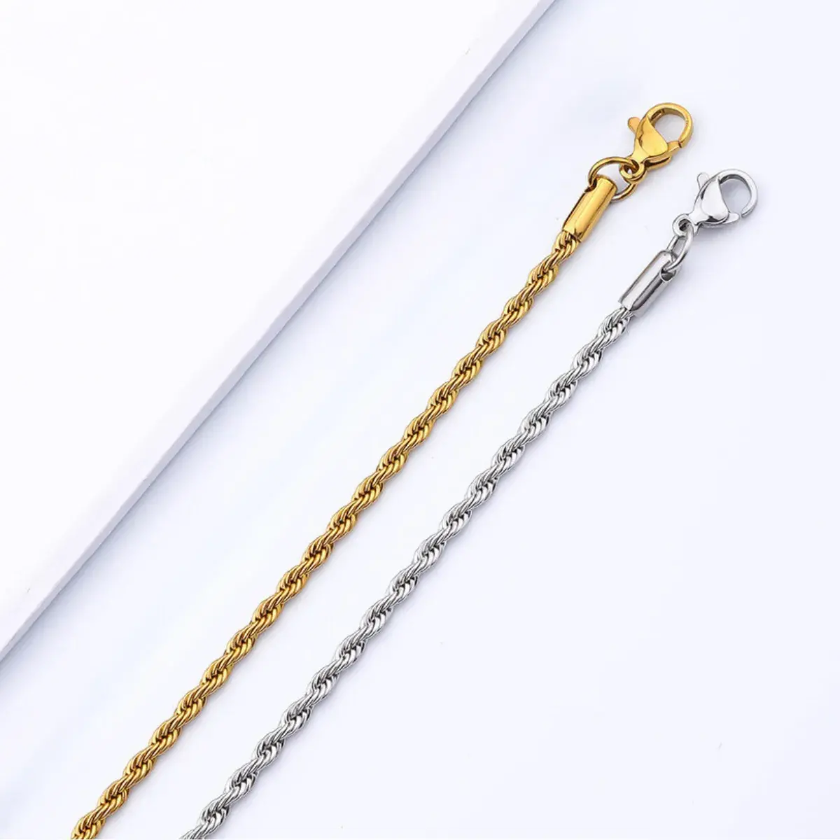 Esta cadena de acero inoxidable de 2.5 mm con diseño torzal delgado es el accesorio perfecto para quienes buscan una pieza elegante y refinada que sea ligera pero resistente. El diseño torzal, caracterizado por su estructura entrelazada y trenzada, añade un toque dinámico y sofisticado que complementa cualquier look, ya sea para el uso diario o para ocasiones más formales. Con su grosor de 2.5 mm, esta cadena es lo suficientemente delicada para lucir sutilmente pero también destaca por su diseño único y moderno.