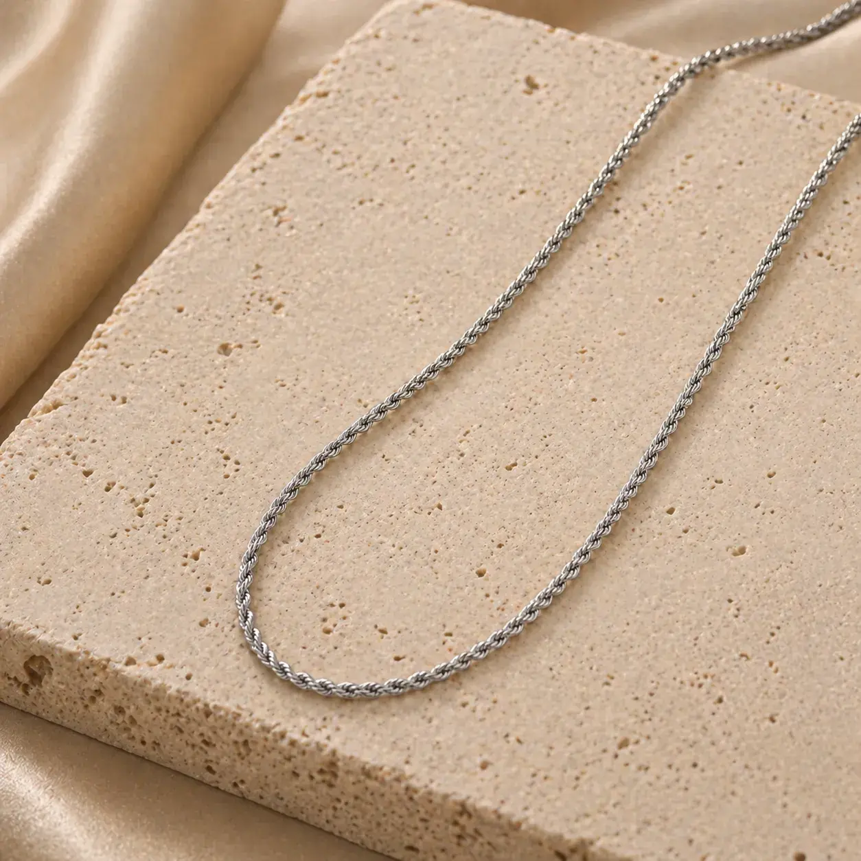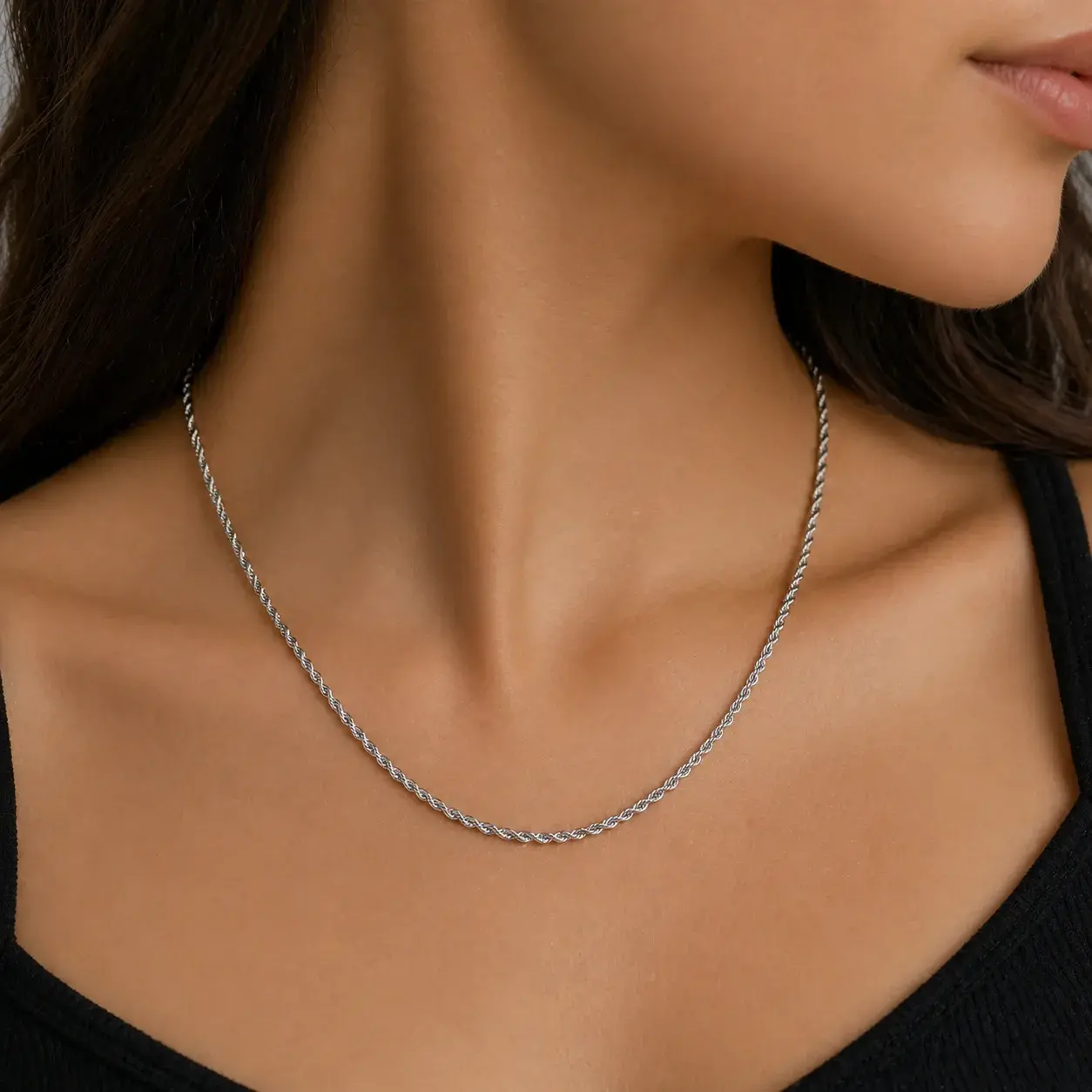 Cadena torzal delgada de acero inoxidable para mujer, ideal para quienes buscan un collar corto, fino y fácil de combinar con cualquier look. Su diseño torzal en color plateado aporta una textura sutil que la hace ver más elegante que una cadena lisa, pero sin perder ese estilo discreto y versátil que funciona muy bien para uso diario. Gracias a su medida de 45 cm de largo y 2 mm de ancho, luce muy bien con blusas, camisas, escotes redondos o outfits minimalistas, ya sea sola o acompañada de dijes pequeños y otras cadenas en layering.