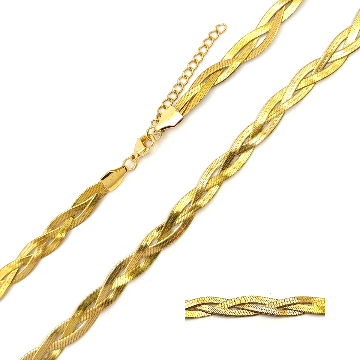 La combinación de tres cadenas planchadas trenzadas proporciona una estructura visualmente rica y de gran flexibilidad, asegurando que la cadena se ajuste cómodamente alrededor del cuello sin enredos. Este diseño elegante y versátil es perfecto tanto para llevar sola como para acompañarla con dijes o colgantes que complementen su estilo refinado.