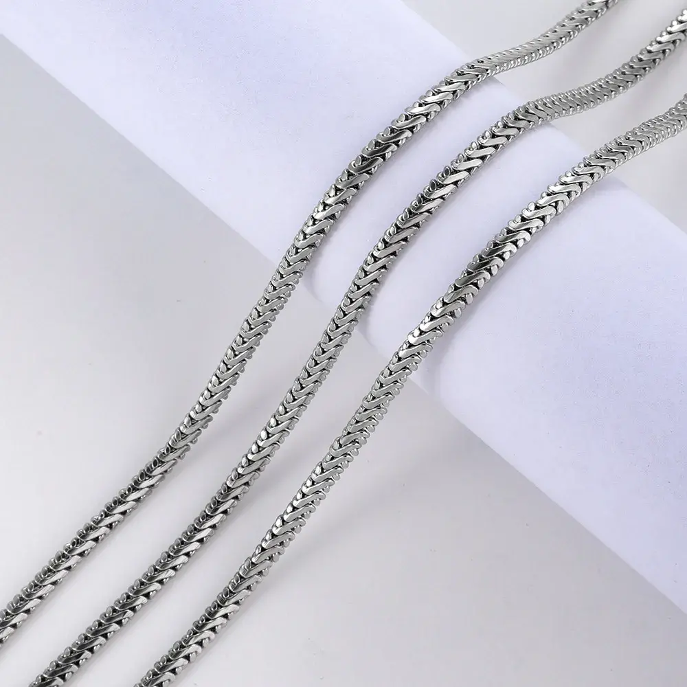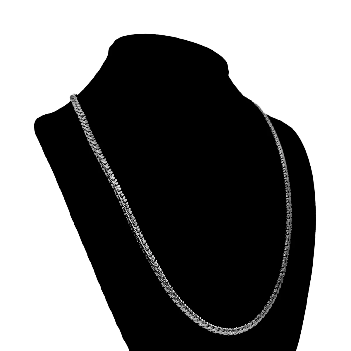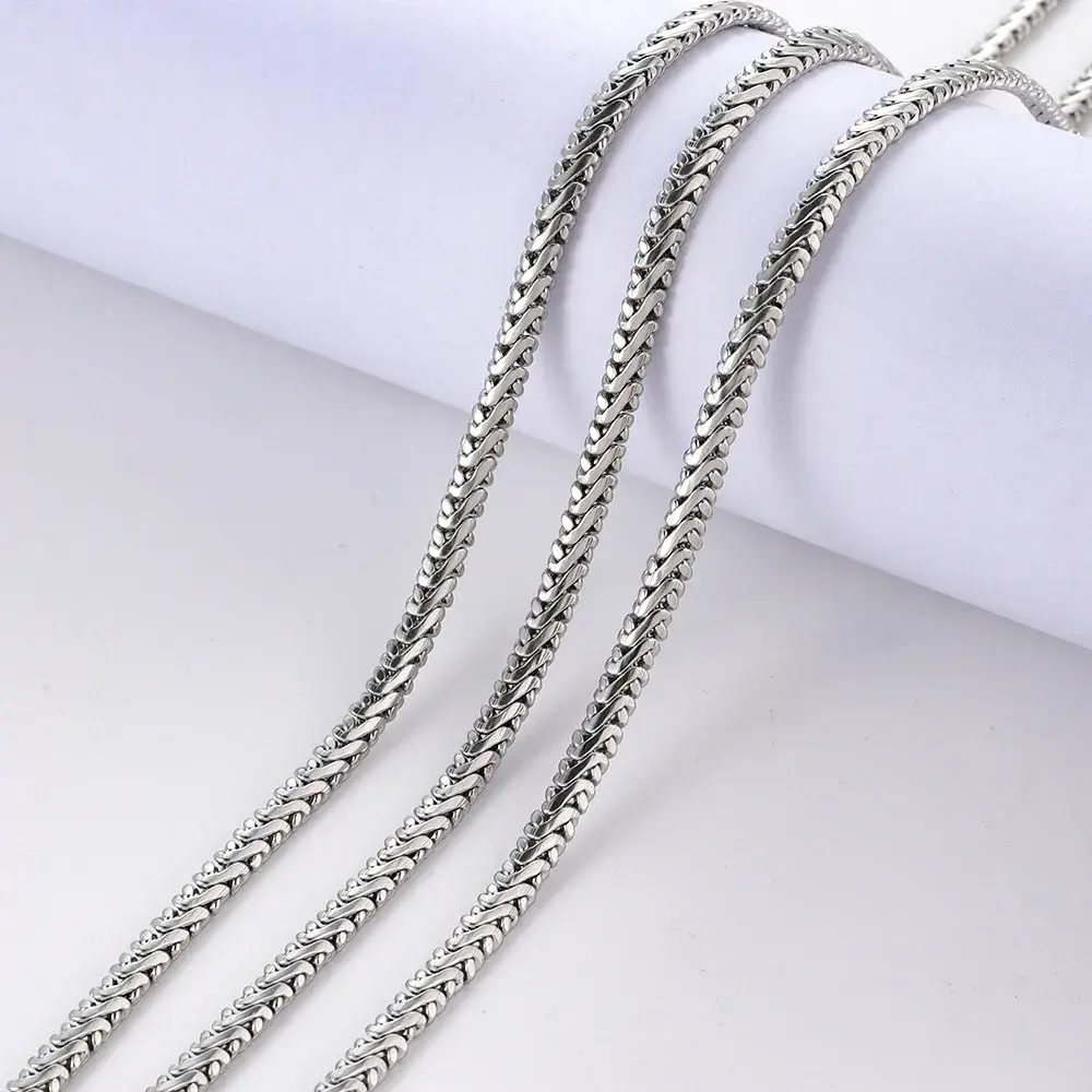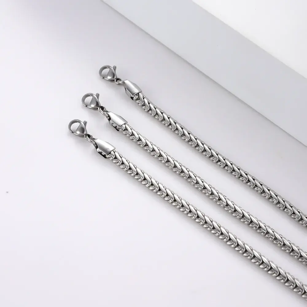 Cadena espiga plateada de acero inoxidable con acabado liso pulido, ideal para quienes buscan un collar con presencia elegante, líneas limpias y un brillo uniforme que se vea moderno desde cualquier ángulo. Su tejido tipo espiga crea una caída más fluida y sofisticada que una cadena básica, por lo que es una excelente opción para elevar camisas, playeras lisas, looks urbanos, outfits de oficina o combinaciones más formales sin necesidad de añadir dijes.