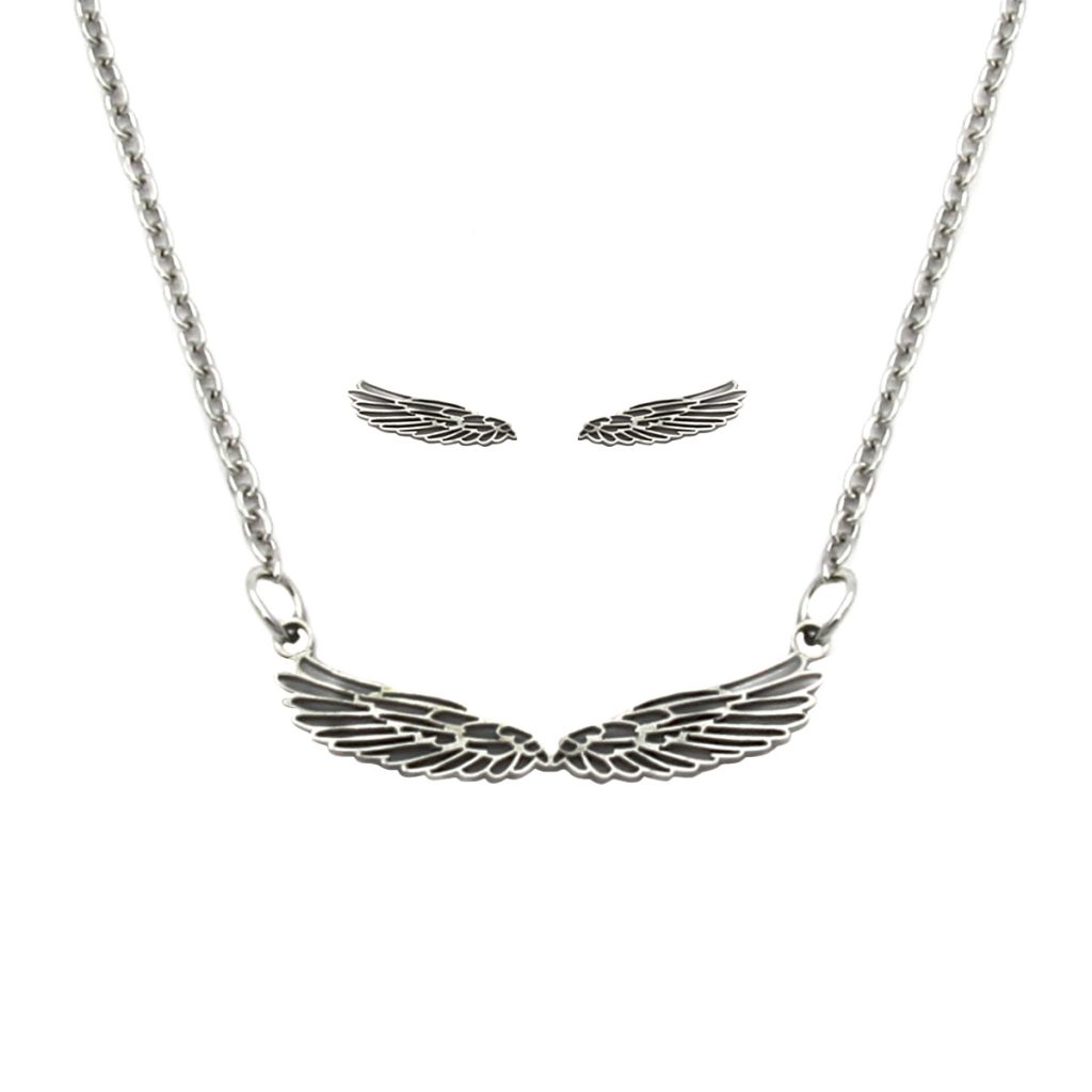 Set Joyeria Acero Plateado Alas Abiertas Angel Silueta