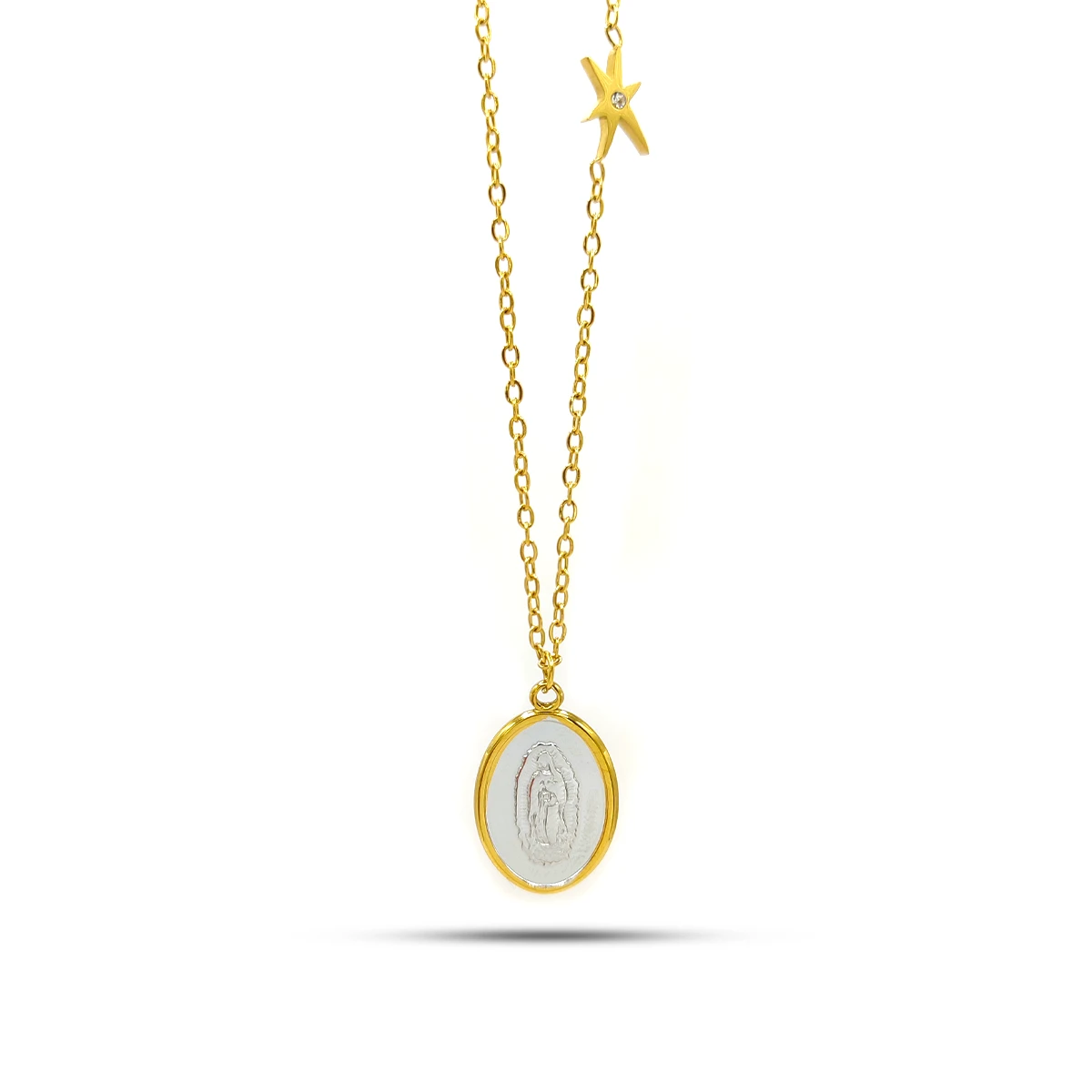 Este collar bicolor de acero inoxidable destaca por su medalla de la Virgen de Guadalupe, un símbolo de fe, protección y devoción profundamente arraigado en la cultura mexicana. La medalla presenta un acabado en dos tonos que realza su diseño y aporta un toque elegante y distintivo. A lo largo de la cadena se encuentran dos estrellas separadas que añaden brillo, delicadeza y un aire celestial que complementa perfectamente el estilo espiritual del collar.