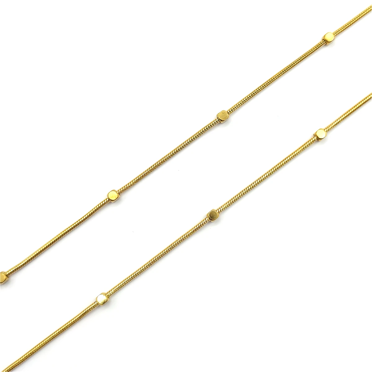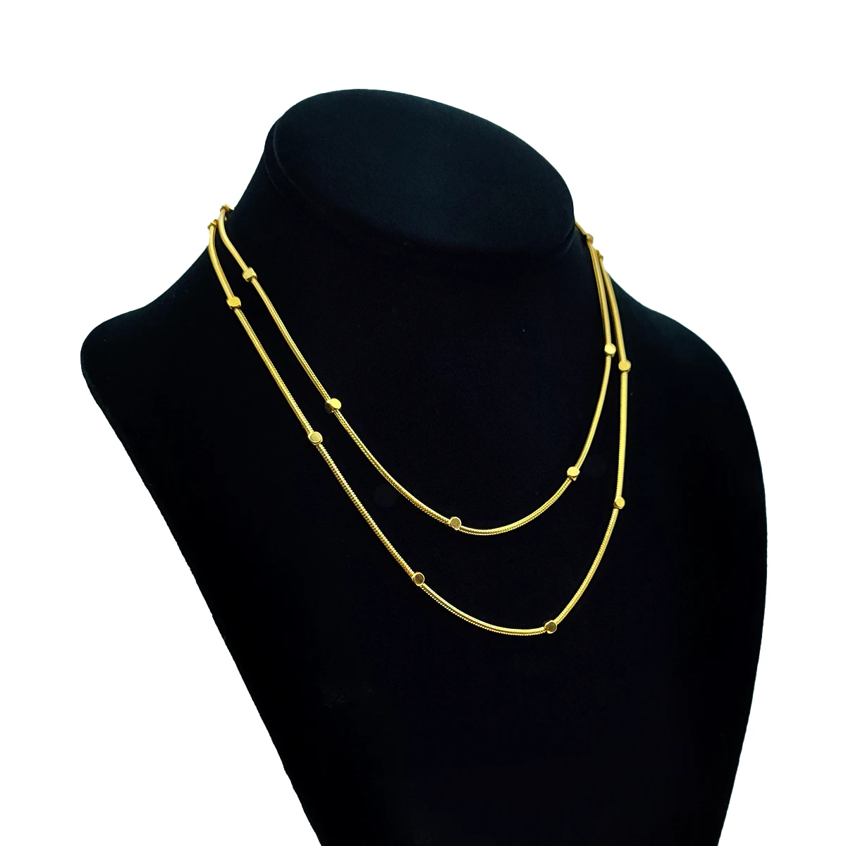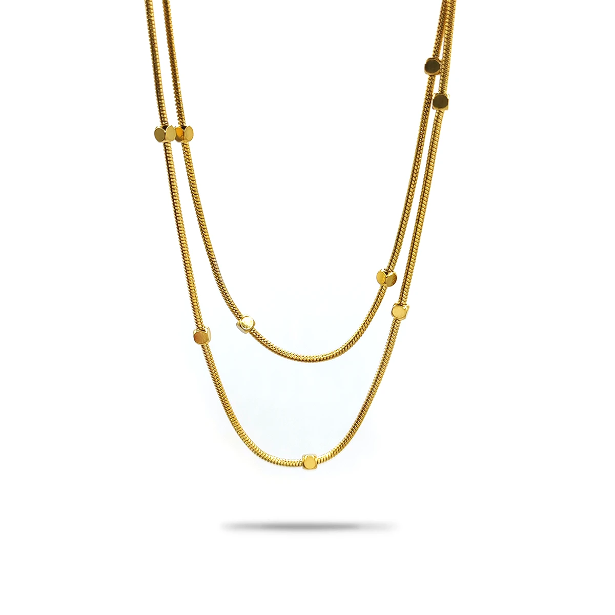 Fabricado con acero inoxidable de alta calidad, este collar garantiza resistencia y un acabado dorado que se mantiene impecable con el tiempo. El diseño de doble cadena tipo cola de ratón añade una dimensión extra de elegancia y sofisticación, con dos delicadas cadenas que crean un efecto de capas. Cada cadena está adornada con pequeños balines cuadrados, que aportan un toque geométrico y moderno al diseño.