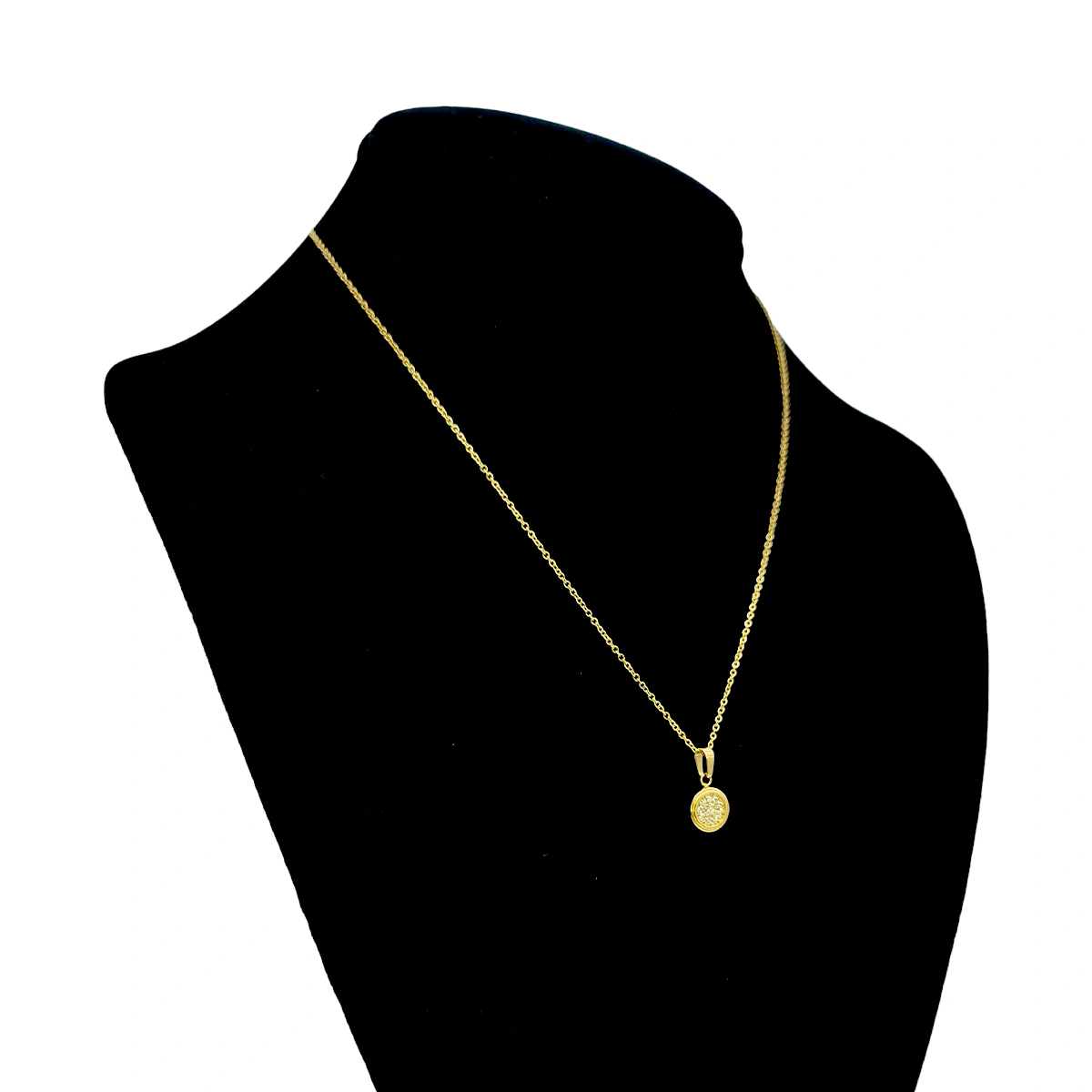 Fabricado en acero inoxidable dorado de alta calidad, este collar garantiza durabilidad, resistencia al desgaste y un acabado brillante que se mantiene impecable con el tiempo. Su diseño presenta un dije en forma de mini círculo, decorado con cristales brillantes, que reflejan la luz con cada movimiento, añadiendo un destello delicado y sofisticado.
