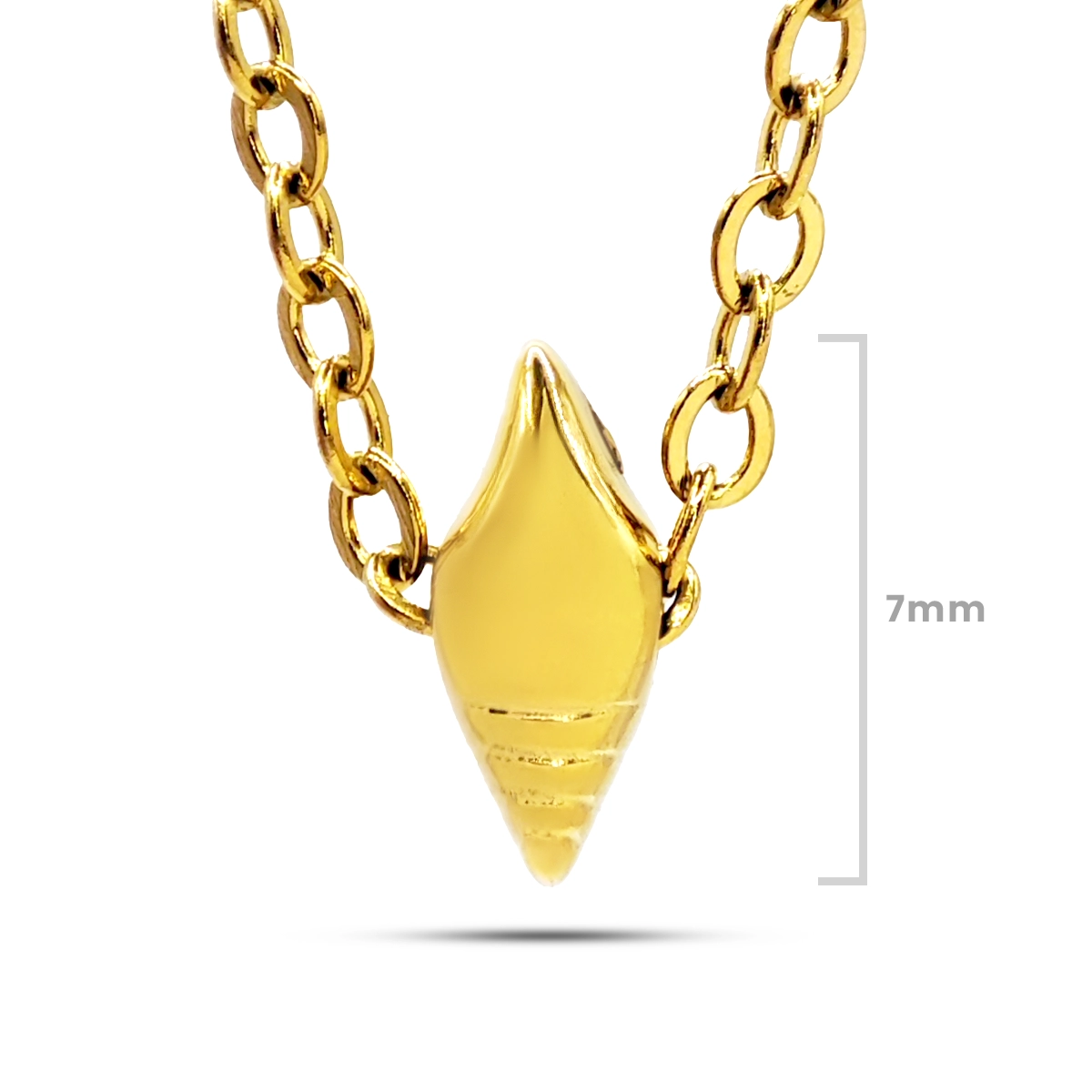El acabado dorado pulido permite que la luz se refleje de manera uniforme sobre la superficie, resaltando las formas naturales de la concha y aportando un brillo suave y sofisticado. Su diseño minimalista lo convierte en una pieza versátil que puede usarse sola para un look sencillo o combinarse con otros collares en capas para un estilo más moderno.