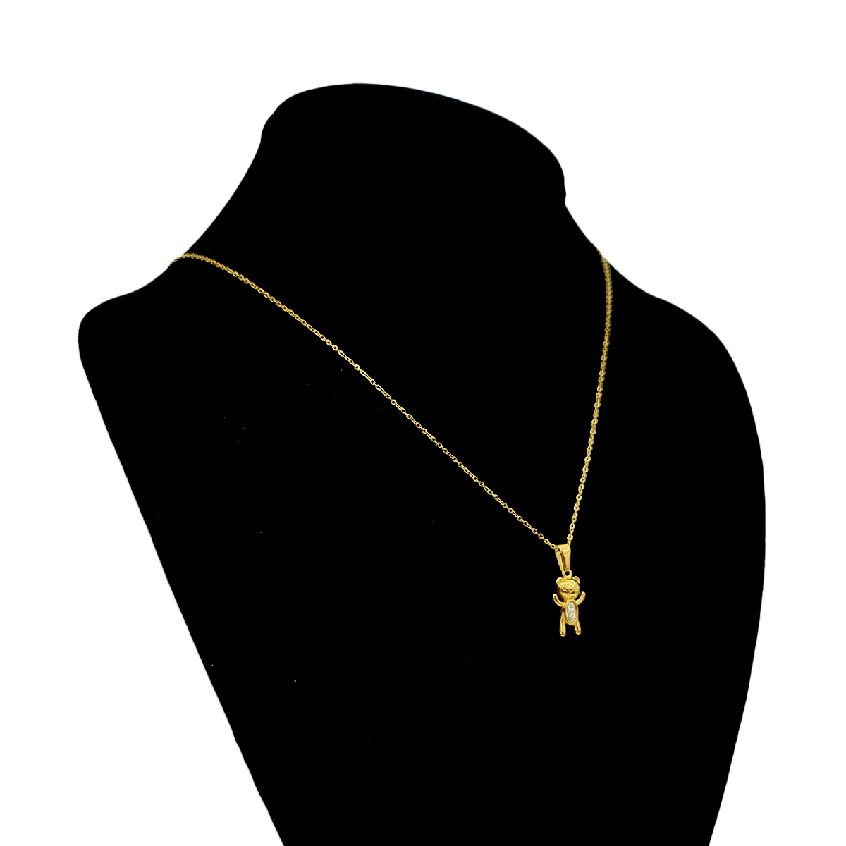 Fabricado en acero inoxidable dorado de alta calidad, este collar ofrece durabilidad, resistencia al desgaste y un acabado brillante que se mantiene impecable con el tiempo. La figura del oso de peluche está cuidadosamente diseñada con detalles delicados, convirtiéndolo en una pieza que evoca ternura y estilo en cualquier ocasión.