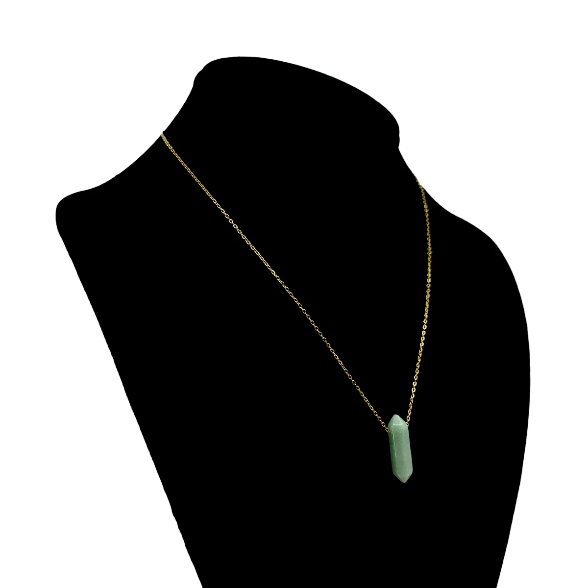 Este collar dorado de acero inoxidable destaca por su diseño con péndulo de doble punta elaborado en aventurina natural, creando un accesorio moderno con un toque distintivo. La forma de doble punta aporta simetría y estilo contemporáneo, mientras que la aventurina es reconocida por su tonalidad suave y apariencia elegante. Su estructura alargada genera una caída estilizada que enmarca el cuello con presencia y equilibrio visual.