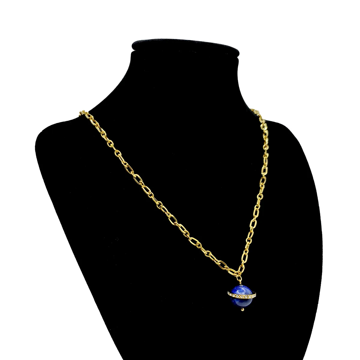 Eleva tu estilo con nuestro espectacular Collar de Acero Dorado. Este collar deslumbrante presenta un diseño único con un dije de saturno adornado con lapislázuli, una piedra asociada con la sabiduría y la comunicación, y un aro decorativo de cristales. Fabricado con acero de alta calidad, este collar combina durabilidad con elegancia. El dije de saturno agrega un toque de originalidad y sofisticación a la pieza, mientras que el lapislázuli, conocido por sus propiedades energéticas que promueven la armonía y el equilibrio emocional, aporta una dimensión adicional de significado.