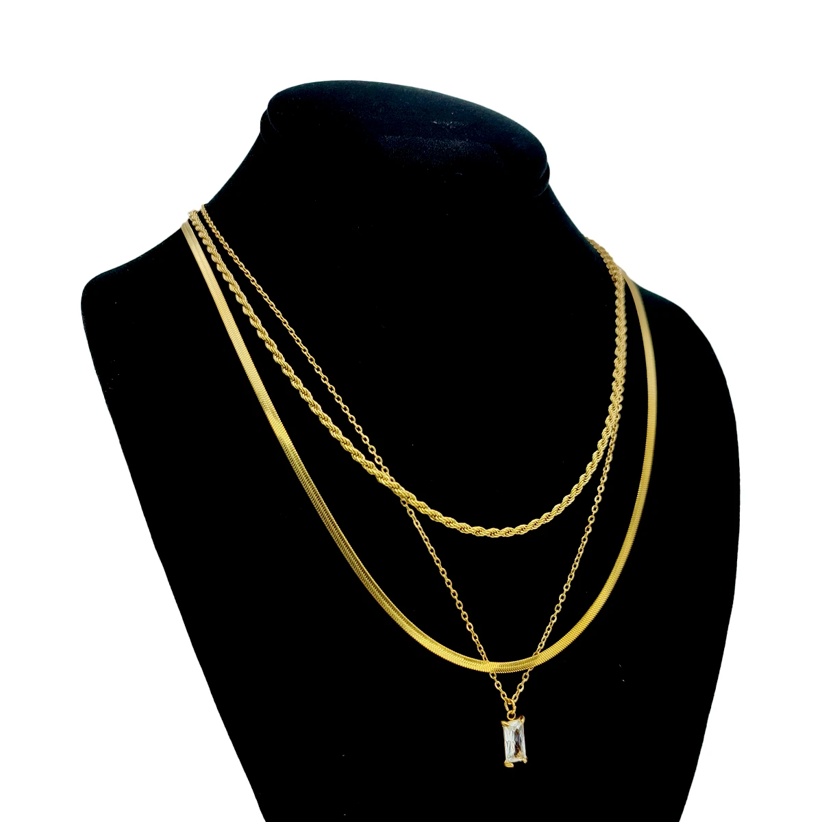 Este collar dorado de acero inoxidable destaca por su diseño triple, compuesto por tres cadenas mixtas que crean un efecto visual moderno, elegante y lleno de estilo. La primera cadena ofrece un toque delicado, la segunda añade presencia con un diseño tipo planchada, y la tercera incorpora un dije de cristal rectangular que aporta brillo, luz y un acabado sofisticado. La zirconia rectangular se convierte en el punto focal del collar, reflejando la luz con un destello sutil y refinado que realza cualquier atuendo.