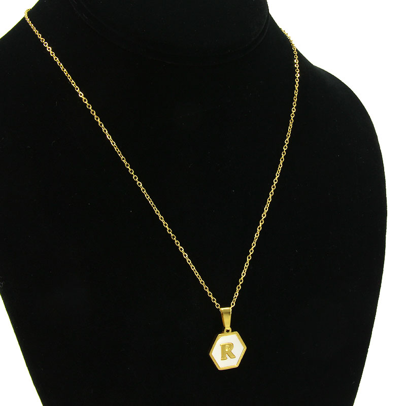 Collar Acero Inox Dorado Hexagonal Letra R Madre Perla
