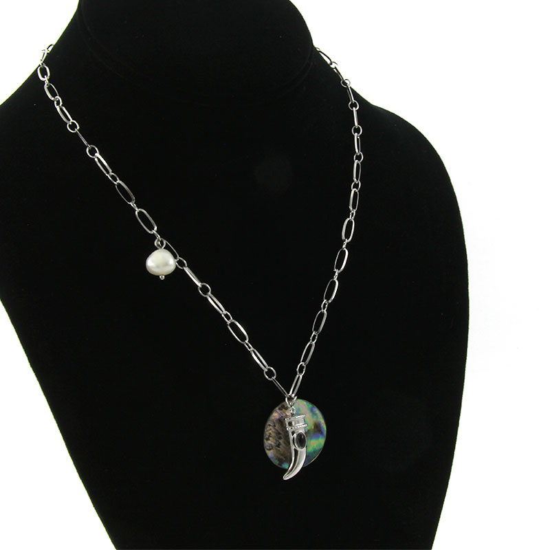 Collar Acero Inox Plateado Colmillo Abulon Perla Natural