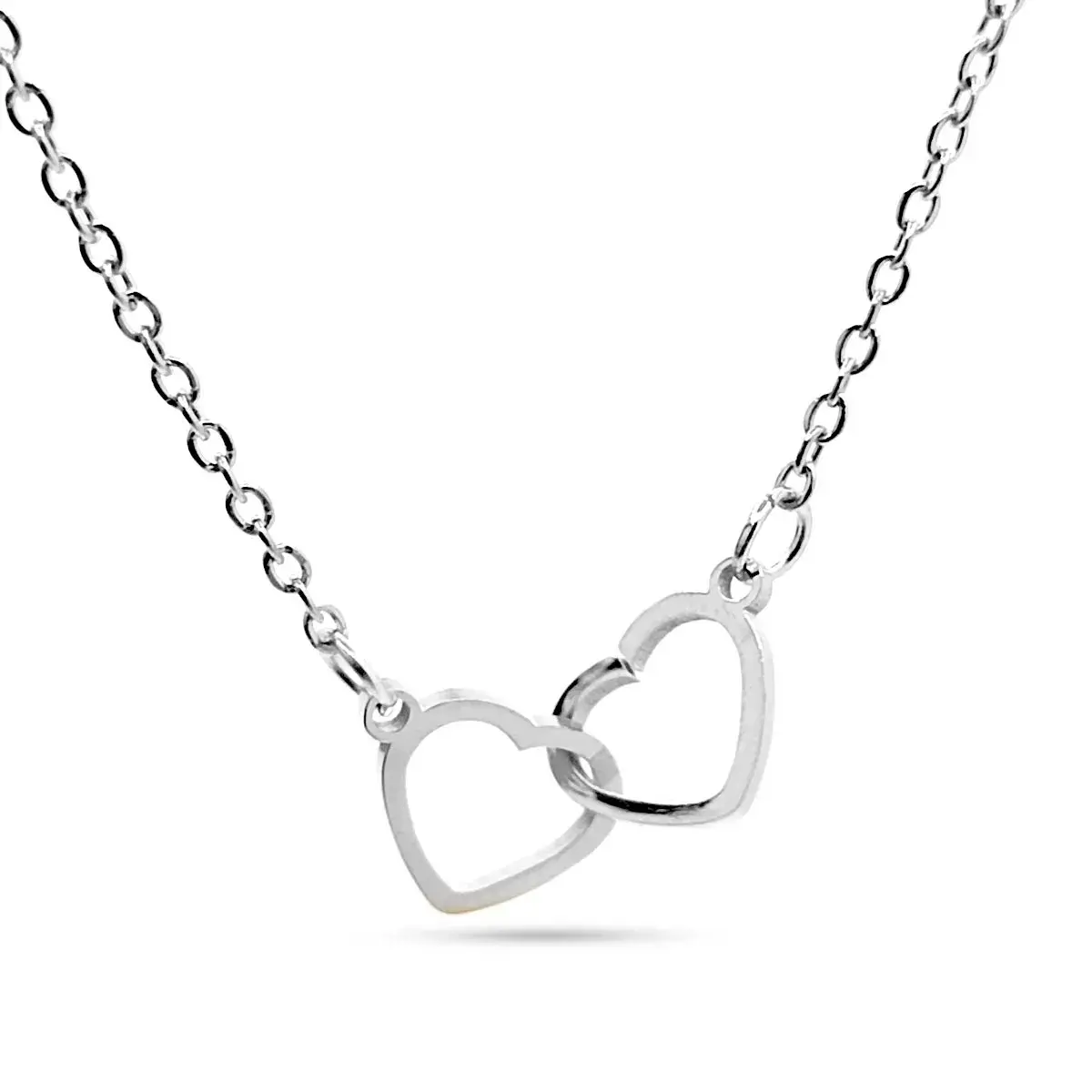 El collar presenta dos corazones entrelazados en acero inoxidable plateado, creando un diseño romántico y atemporal. La elegancia de este collar lo hace adecuado para cualquier ocasión, ya sea para el uso diario o para momentos especiales.