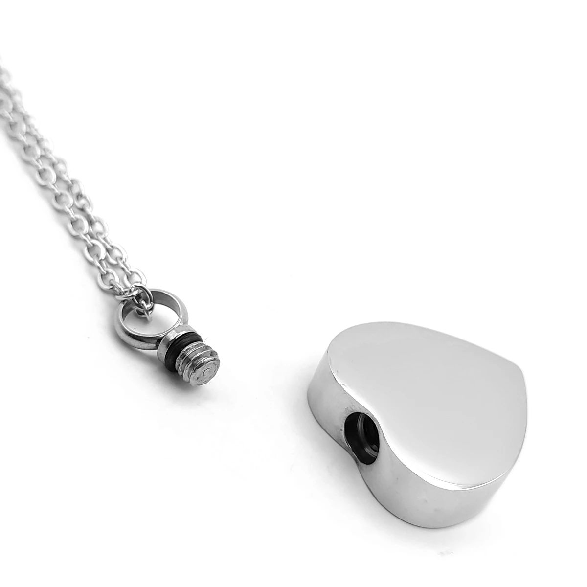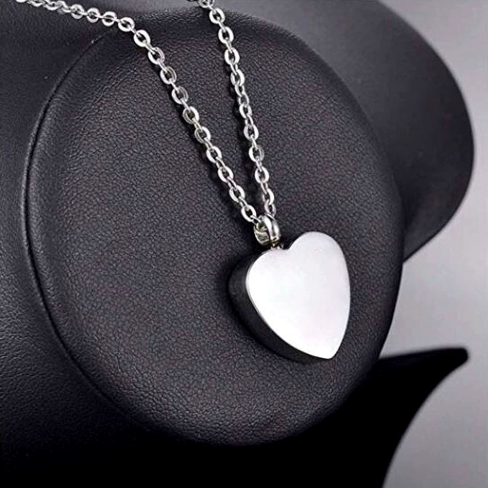 Collar de acero plateado con urna en forma de corazón para grabado. Ideal para perfume, cenizas o flores secas. Emotivo y elegante.