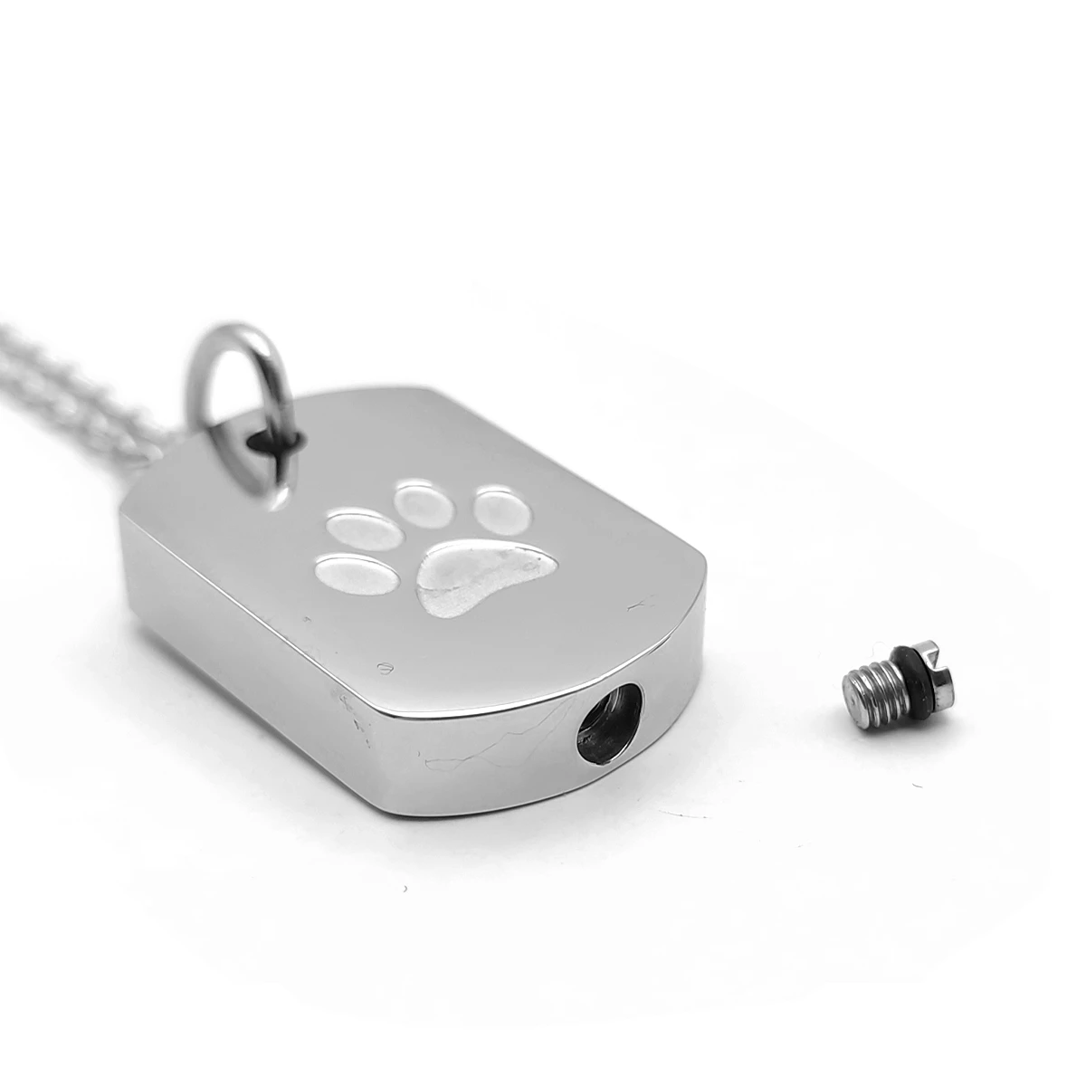 Lleva contigo el recuerdo eterno de tu mascota con el Collar de Acero Inoxidable Plateado con Urna en Forma de Placa Militar y Huella de Mascota para Grabado, un accesorio conmemorativo diseñado para guardar cenizas, perfume, flores secas u otro recuerdo significativo de tu compañero fiel. Este collar es ideal para quienes desean honrar y mantener cerca a su mascota con un símbolo de amor y memoria eterna.