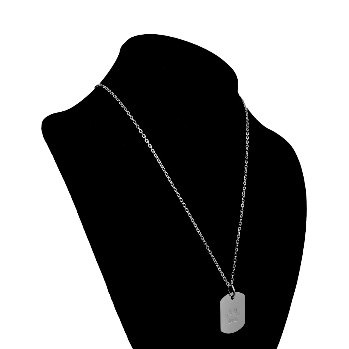 Fabricado en acero inoxidable plateado de alta calidad, este collar garantiza durabilidad, resistencia al desgaste y un acabado brillante que perdura con el tiempo. Su diseño en forma de placa militar vertical con puntas redondeadas le otorga un estilo moderno y elegante, mientras que la huella de mascota grabada en el centro añade un toque emotivo y personal.
