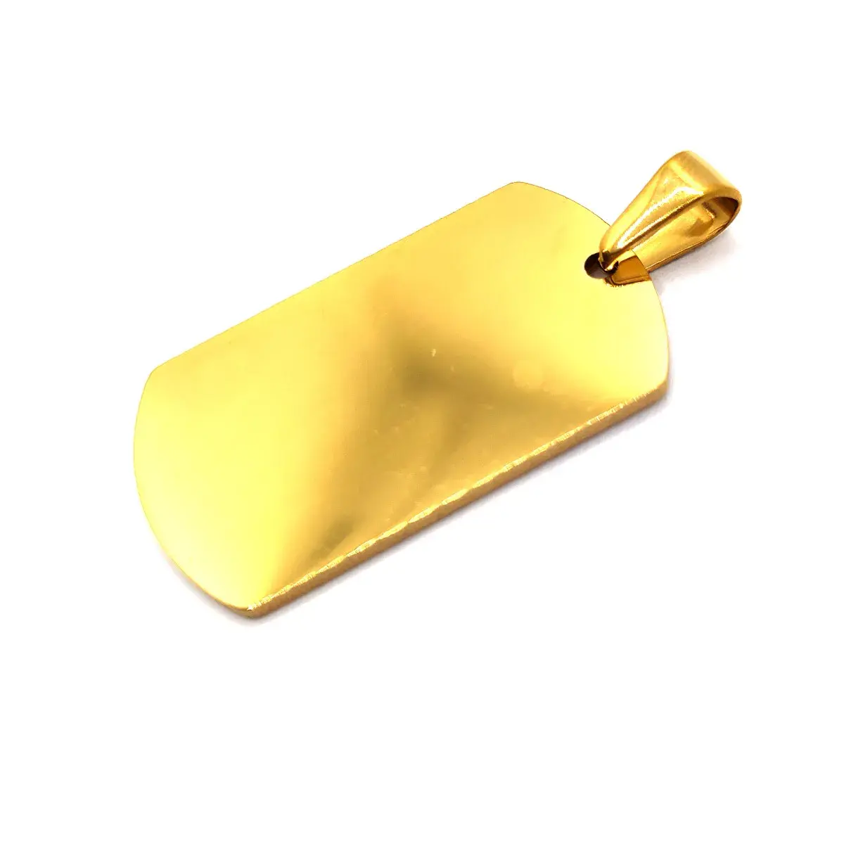 La durabilidad y resistencia del acero inoxidable dorado garantizan que este dije mantenga su brillo y calidad a lo largo del tiempo, y la superficie de la placa es ideal para grabados precisos. Puedes personalizarlo con tu elección de texto o diseño.