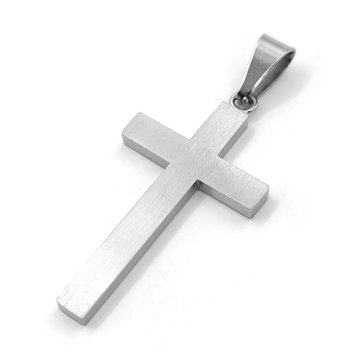 Fabricado en acero inoxidable plateado de alta calidad, este dije garantiza resistencia al desgaste, durabilidad y un acabado impecable, asegurando que su brillo y diseño se mantengan intactos con el paso del tiempo. Su diseño presenta una cruz de 35 mm de altura, realzada con esmalte negro, que le da un aspecto contemporáneo y refinado, resaltando los detalles con un contraste elegante.