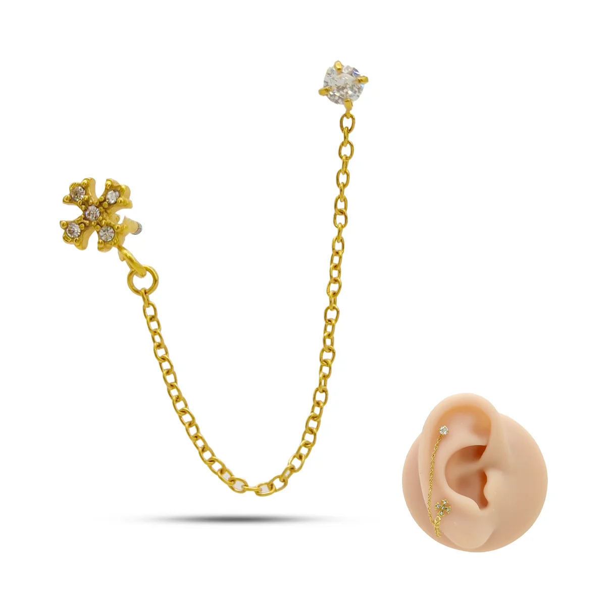 El diseño con cadena añade movimiento y dinamismo, logrando un accesorio diferente a los piercings tradicionales. Puede colocarse en el lóbulo y el hélix, o en dos perforaciones cercanas del lóbulo, adaptándose a distintos estilos y preferencias. Su cierre seguro y su peso ligero lo convierten en una pieza práctica y cómoda para cualquier ocasión.