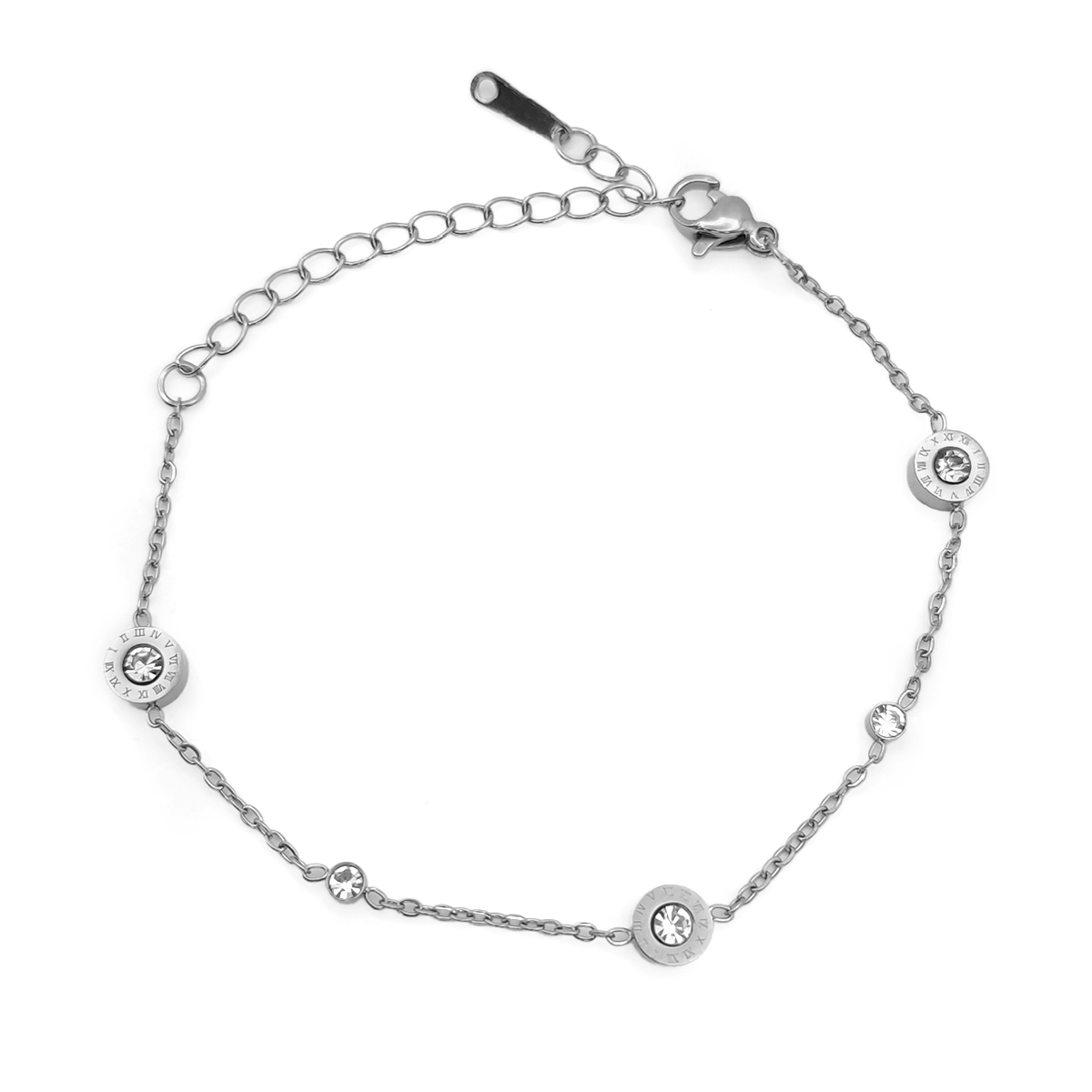 Pulsera de acero inoxidable con números romanos y cristales claros pensada para quienes buscan un accesorio elegante, durable y fácil de combinar. El diseño de círculos decorativos aporta un brillo fino y moderno que realza la muñeca sin verse exagerado, por lo que funciona muy bien tanto con outfits casuales como con looks más pulidos.