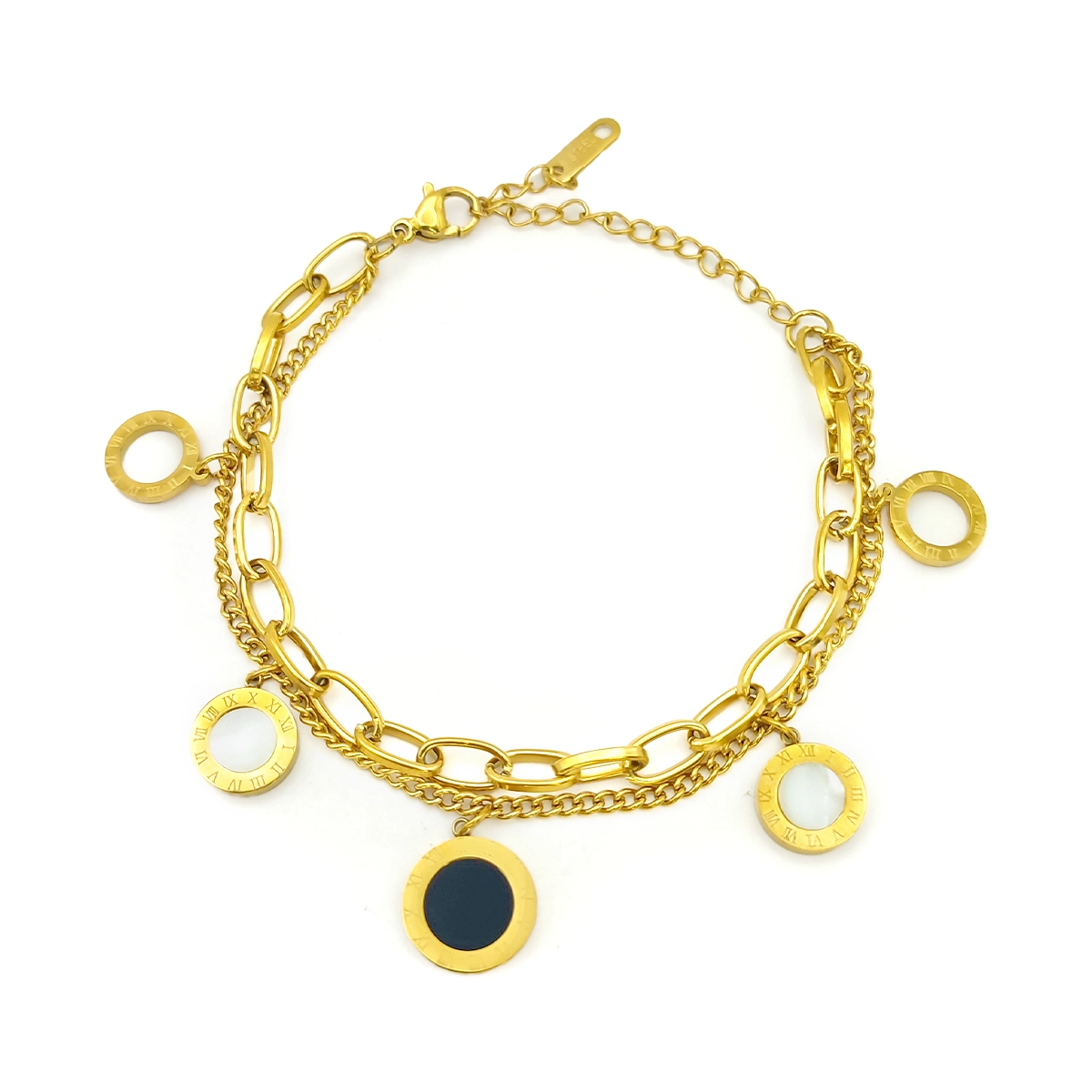 Pulsera doble de acero inoxidable con madre perla, diseñada para quienes prefieren accesorios con más detalle visual y una apariencia refinada sin caer en lo exagerado. La combinación de cadena oval de 5 mm con cadena cubana de 2 mm crea un efecto en capas que hace ver la muñeca más estilizada y mejor vestida, mientras los círculos colgantes aportan movimiento y un toque contemporáneo.