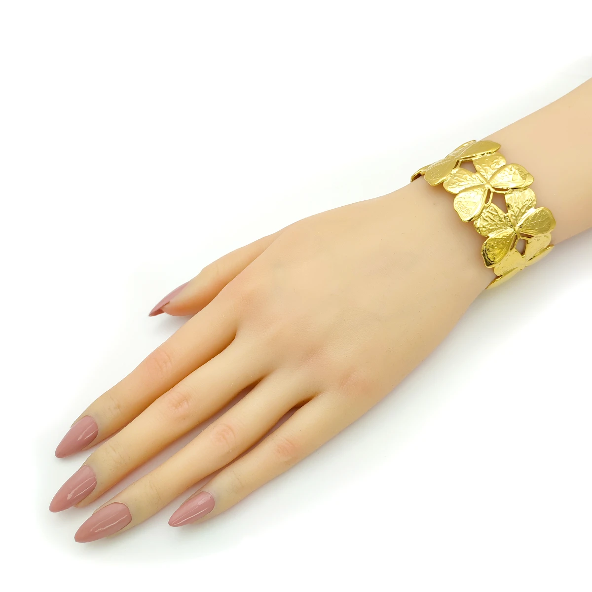 Esta pulsera dorada de acero inoxidable destaca por su diseño tipo brazalete ancho decorado con mariposas, creando un estilo moderno, femenino y lleno de movimiento. Las mariposas, símbolo de transformación y libertad, aportan un toque sofisticado y encantador que convierte la pieza en un accesorio llamativo sin perder la elegancia. Su estructura ancha proporciona presencia visual, mientras que el acabado pulido resalta cada silueta de mariposa con un brillo uniforme y refinado.