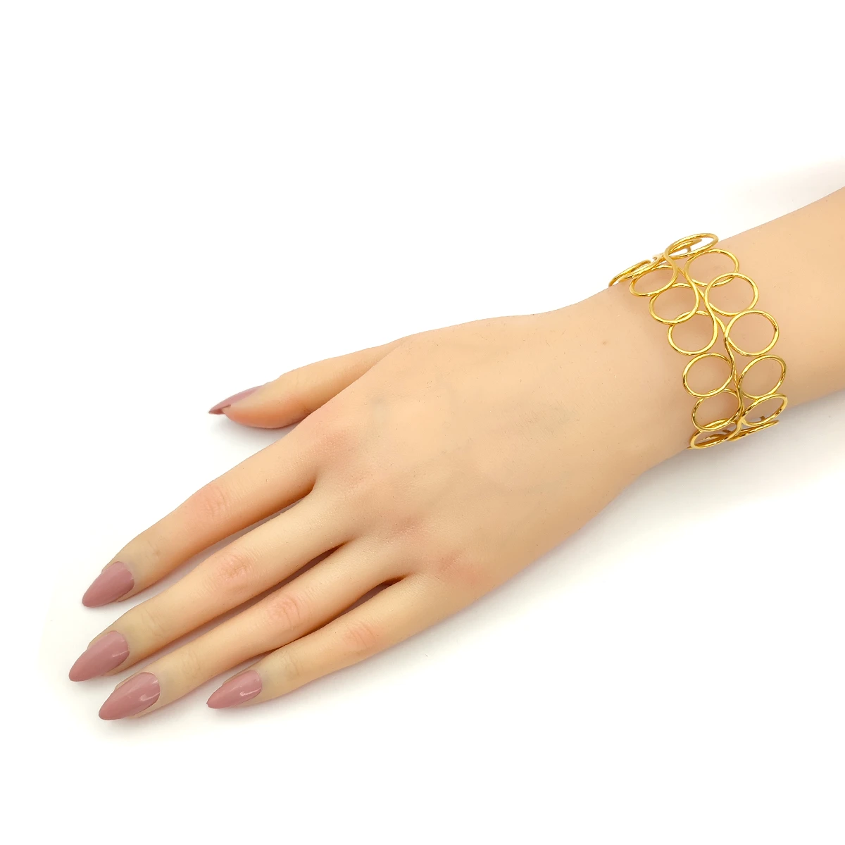La forma de los círculos y la disposición en hileras dan a este brazalete un aspecto dinámico y contemporáneo. Su acabado dorado añade un toque de lujo que realza cualquier look, desde conjuntos casuales hasta atuendos más formales. Esta pieza es ideal para quienes quieren destacarse con un accesorio que refleja modernidad y estilo artístico.