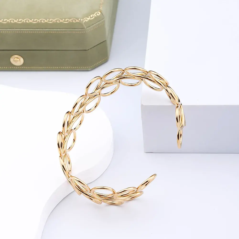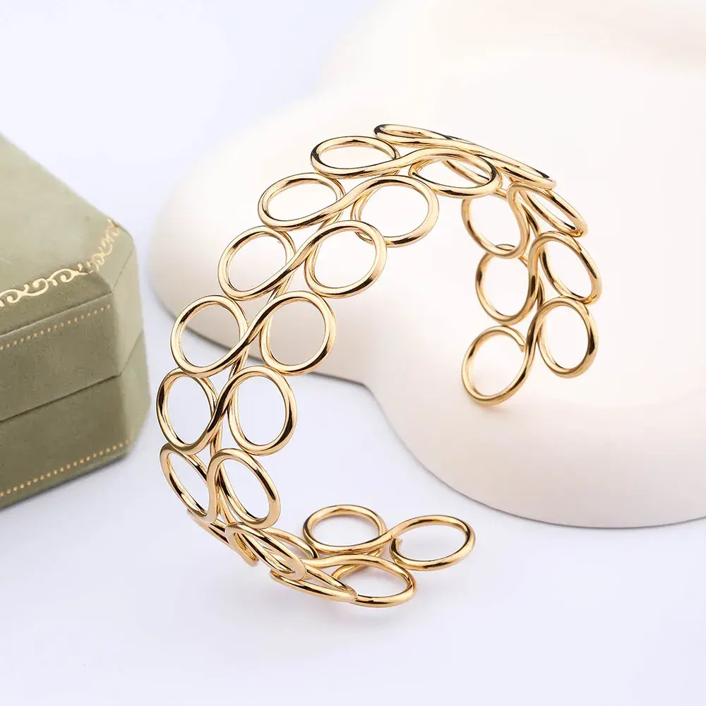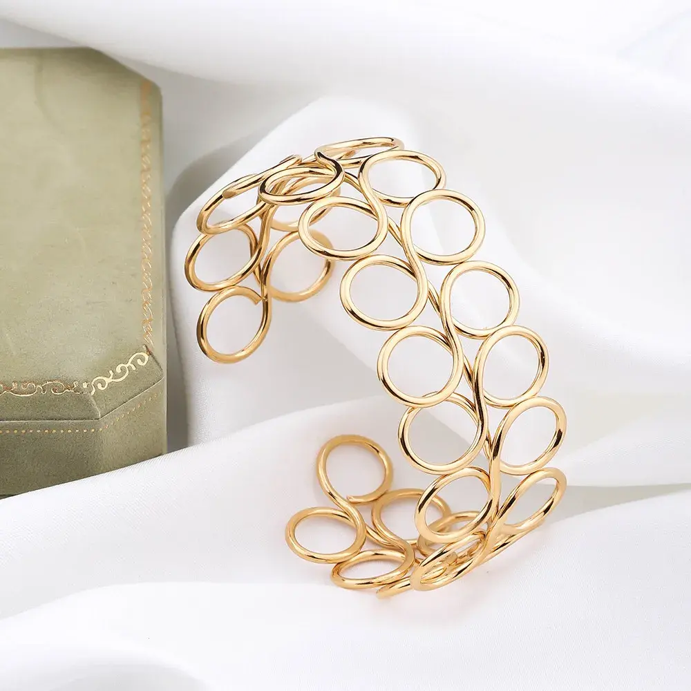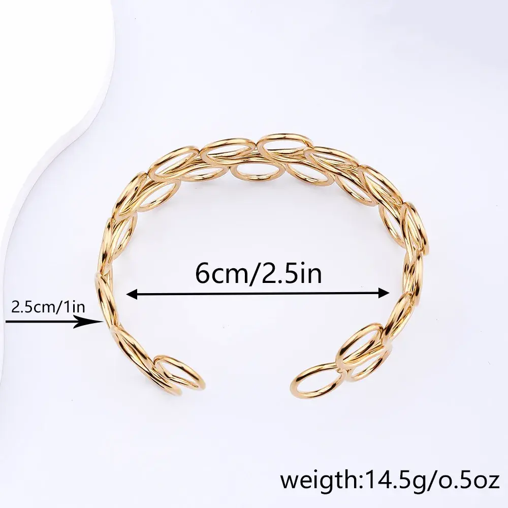 El brazalete de acero dorado con diseño de círculos de alambre es una pieza única que destaca por su creatividad y estilo moderno. Este brazalete tipo alambrismo presenta dos hileras de círculos entrelazados, uno arriba y otro abajo, creando un patrón de bucles que aporta una textura visual impresionante. Su estructura abierta y diseño hueco le confieren un aspecto ligero y elegante, perfecto para quienes buscan una joya que combine sofisticación y originalidad.