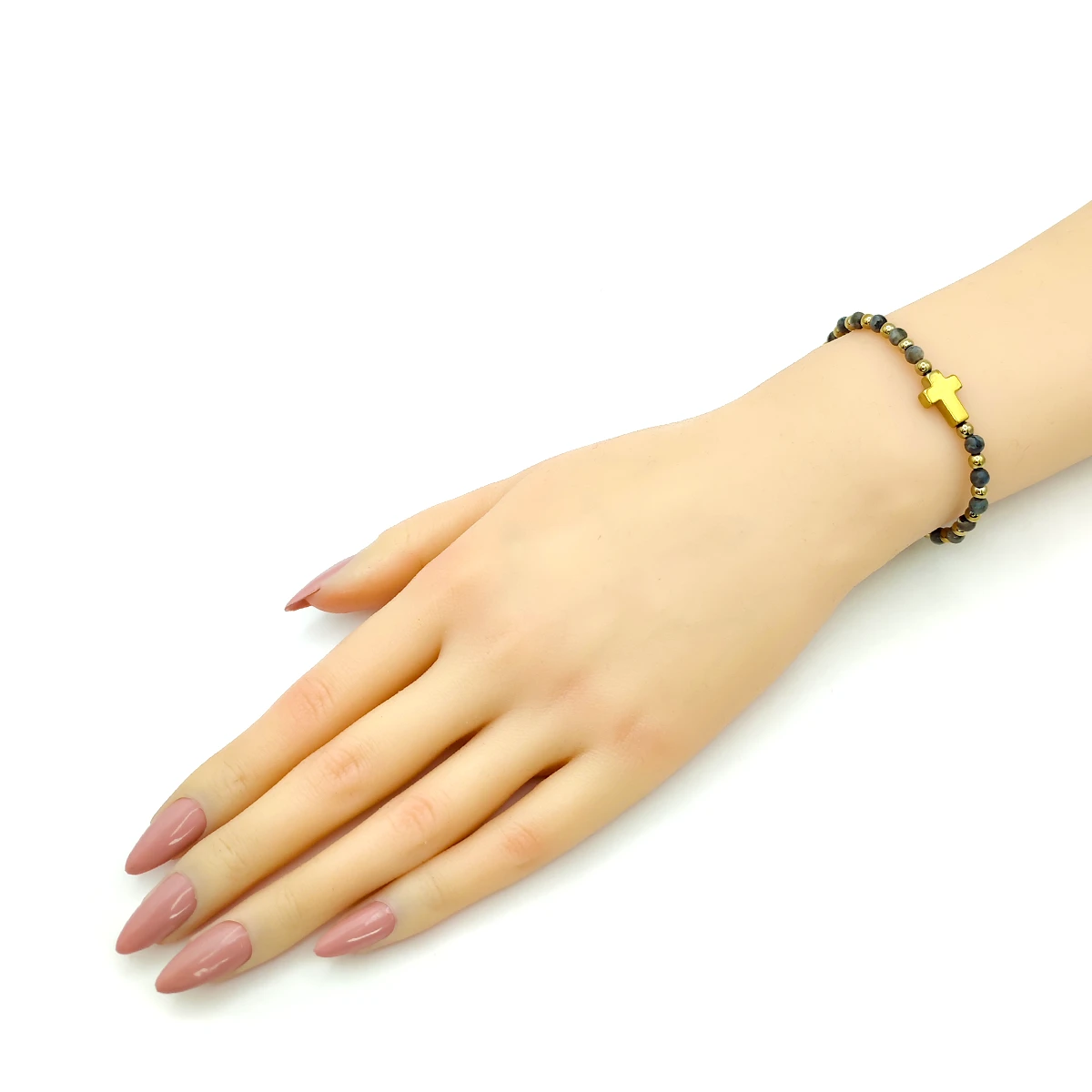 Esta pulsera dorada de acero inoxidable destaca por su combinación sofisticada de cuentas de labradorita natural y un dije central de cruz, creando un accesorio moderno con significado espiritual. La labradorita es reconocida por sus destellos iridiscentes que cambian con la luz, aportando profundidad, misterio y un brillo único a cada pieza. La cruz complementa el diseño como símbolo de fe, protección y fortaleza, logrando un equilibrio armonioso entre estilo y simbolismo.