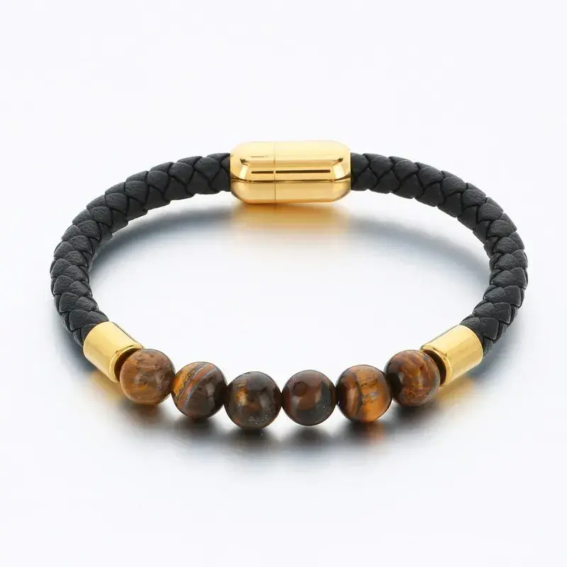 Luce un diseño sofisticado y lleno de carácter con la Pulsera de Acero Inoxidable Dorado con Piel, Cuentas de Ojo de Tigre y Cierre de Imán, un accesorio moderno que combina materiales de alta calidad y simbolismo en una pieza elegante y versátil.