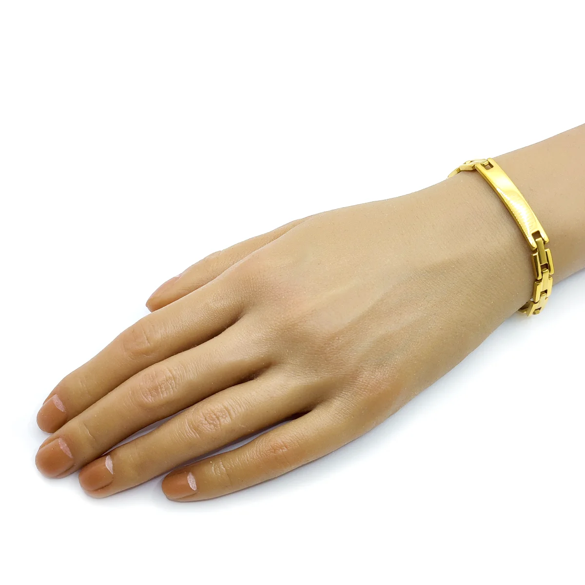 Añade un toque clásico con nuestra pulsera de acero dorado tipo esclava, con placa de 7mm para un estilo elegante.