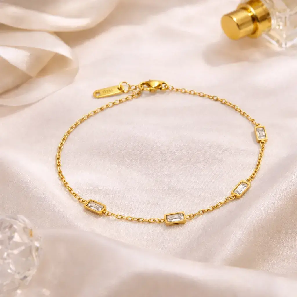 Esta pulsera dorada de acero inoxidable es una gran elección para quien busca un detalle fino que sí se note, pero sin recargar la muñeca. Su cadena ligera incorpora zirconias rectangulares claras que reflejan la luz de forma sutil y dan una apariencia más pulida al outfit, por lo que funciona muy bien con blusas, camisas, vestidos o conjuntos de oficina.