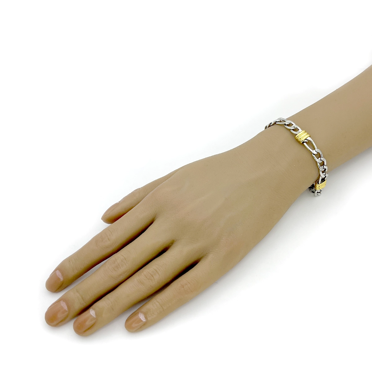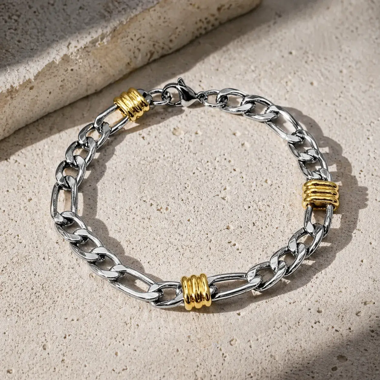 Pulsera bicolor de acero inoxidable para hombre con diseño 3×1 y remaches, pensada para quienes prefieren accesorios con presencia limpia y un contraste metálico que se vea actual. El plateado de la cadena con acentos dorados logra una combinación fácil de integrar con reloj, cinturón o anillo, por lo que funciona muy bien en oficina casual, salidas, cenas o como regalo masculino con mejor impacto visual.