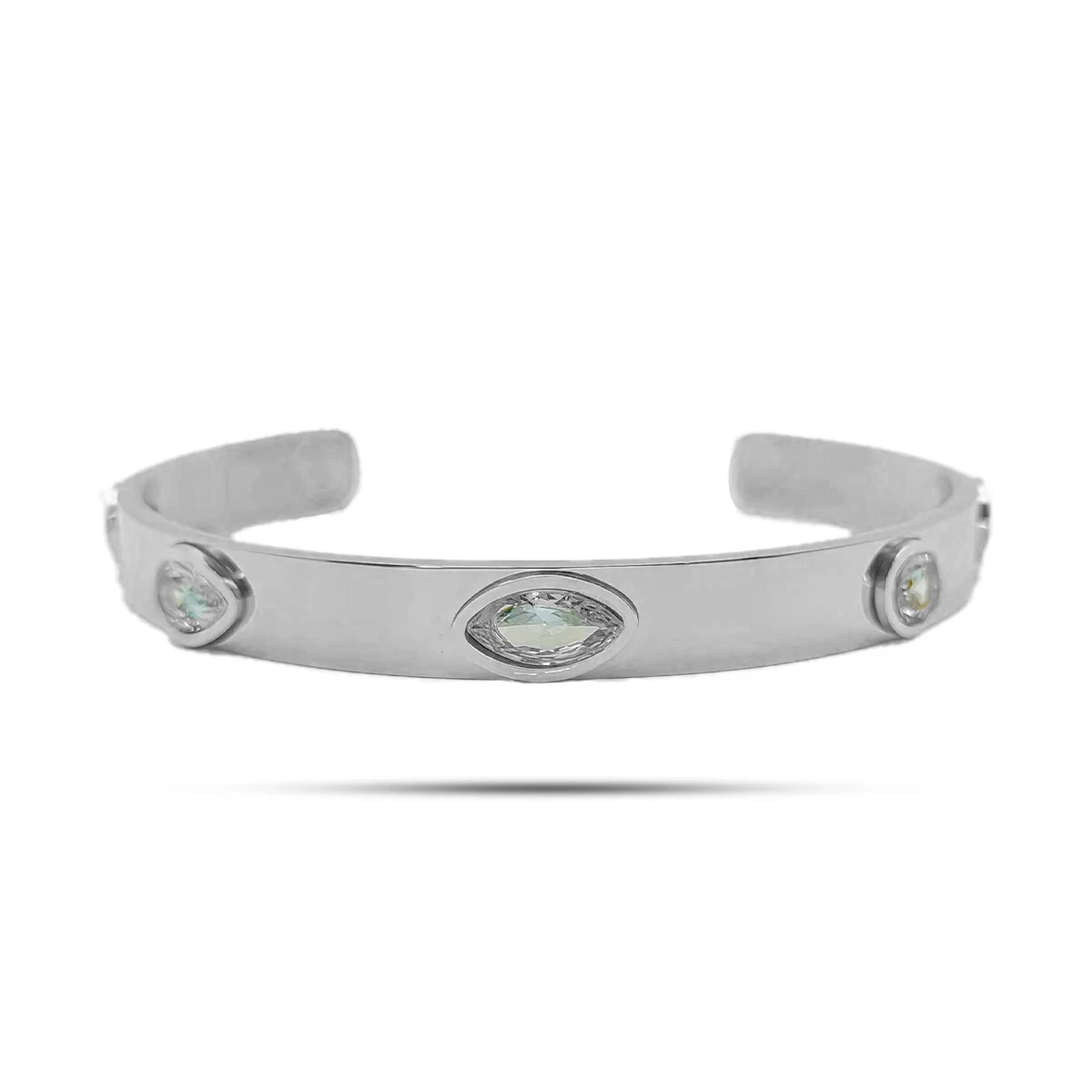 El acabado pulido resalta la pureza de las piedras, creando un contraste armónico que realza su diseño contemporáneo. Fabricado con acero inoxidable de alta calidad, este brazalete es resistente al desgaste, la oxidación y el paso del tiempo, garantizando una durabilidad excepcional sin perder su encanto ni su color original.